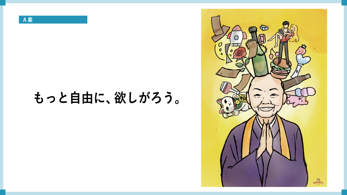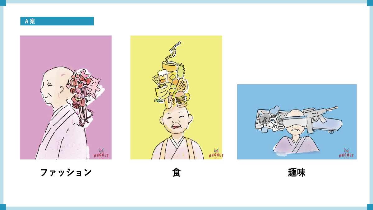 A案では、欲がなさそうな人であるお坊さん(ここでは尼さんで想定は瀬戸内寂聴さん)を起用。尼さんの周りに様々な欲がマグネットのようにくっつき、笑顔になっているイメージにすることで、普段欲がなさそう人でも自由に欲しがれる場所であることを表現しました。また、A案では各フロアに合わせた展開案も提案しました。