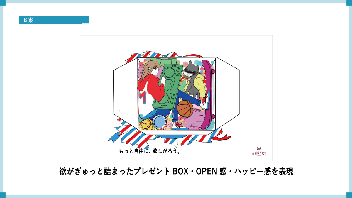 B案では、欲がぎゅっと詰まったプレゼントボックスを開けたイメージにすることで、オープン感とハッピー感を表現しました。