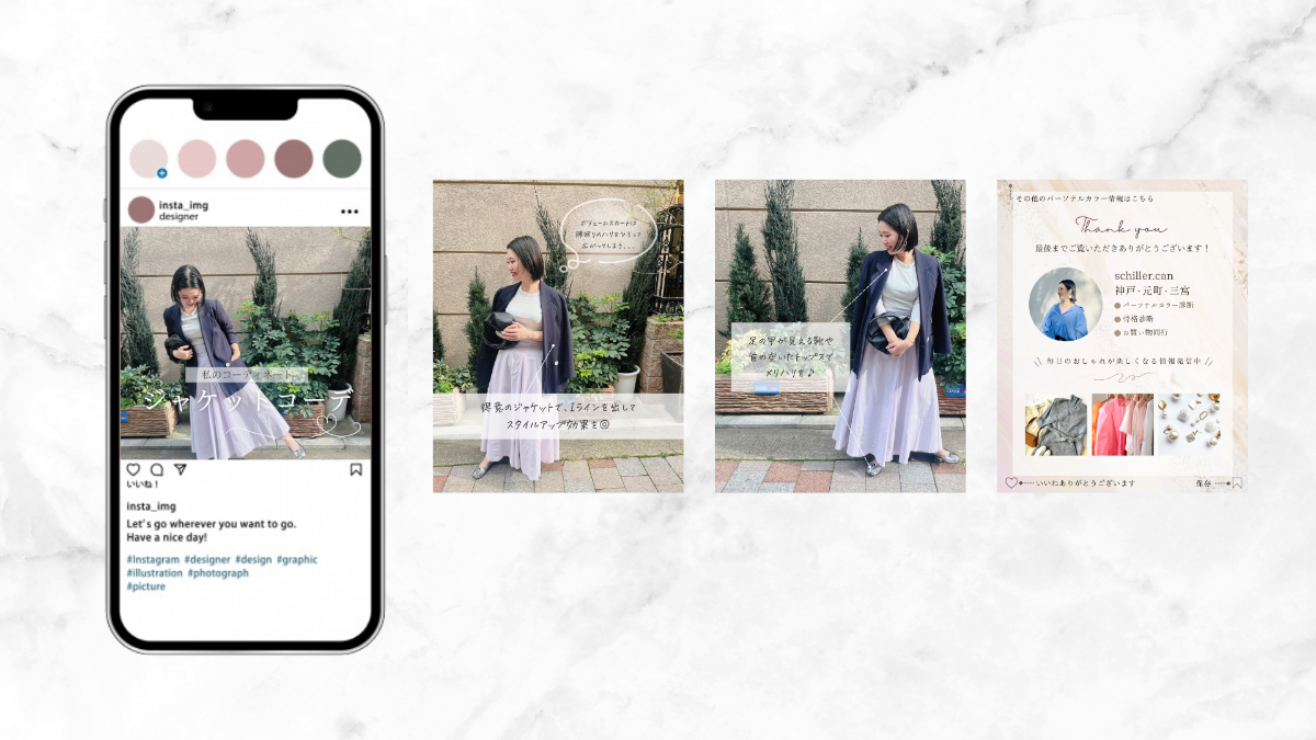パーソナルカラーサロンschiller.can様のInstagram投稿作成を行いました。"私のコーディネート〜ジャケットコーデ〜"をテーマにキャッチ・デザインを行いました。