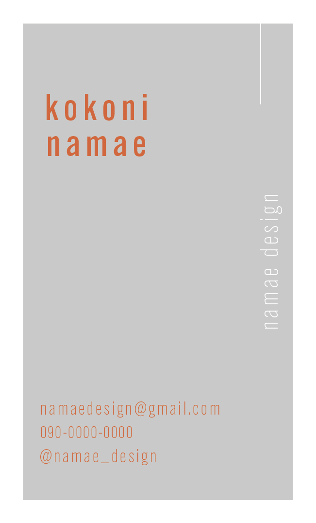 名刺/自主制作 ななか designer/marketer OVERVIEW デザイナー名刺 YEAR 2021 🌿作成した名刺🌿作成時間約2時間🌿ポイント・グレー×オレンジで遊び心を出しつつも、少し聡明な印象になるようにフォントにこだわった。・肩書きを横向きにし、ラインを加えることでデザイン性をアップ。