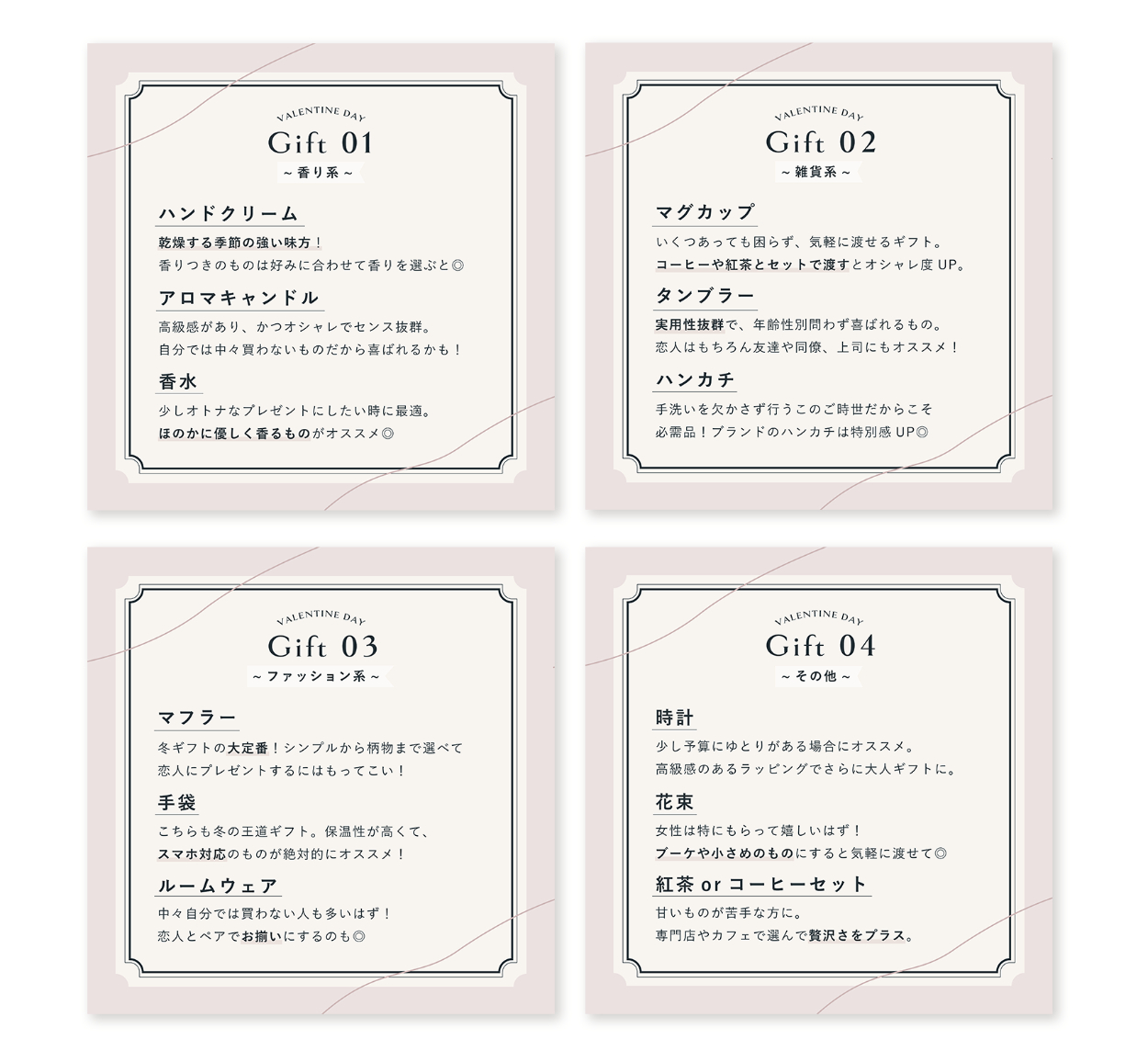 バレンタインが近づいてきた中で、チョコレート以外のバレンタインプレゼントは何かを考え、ジャンルに分けて12個挙げました。