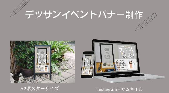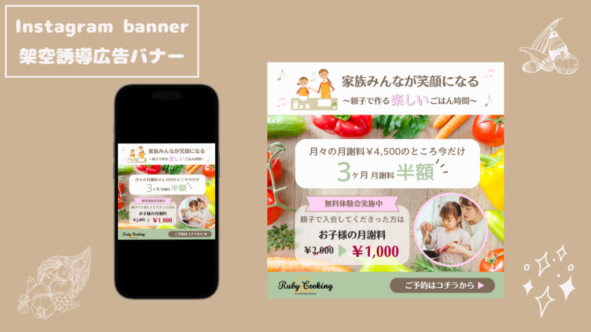 ・楽しさを伝えたかったのでイラストと写真で親子で料理している物を選び、キャッチコピーの周りに音符を使用したのと、さりげなく写真の周りにキラキラのフレームを使用し明るい印象を出しました。