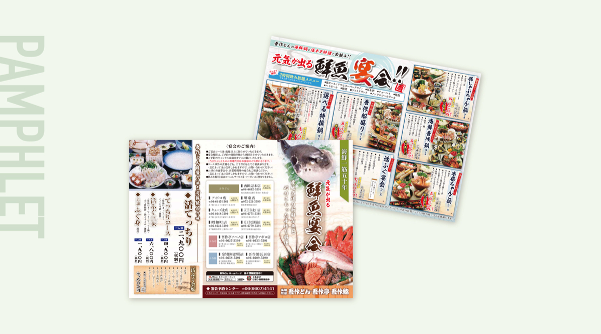 【リーフレット】店舗設置用 宴会メニュー 渡利 亜有子 グラフィックデザイナー ●ツール / A4サイズ 巻き三つ折(両面印刷)● 内容 / 宴会メニュー春の歓送迎会シーズンと年末の忘年会シーズンの年2回制作