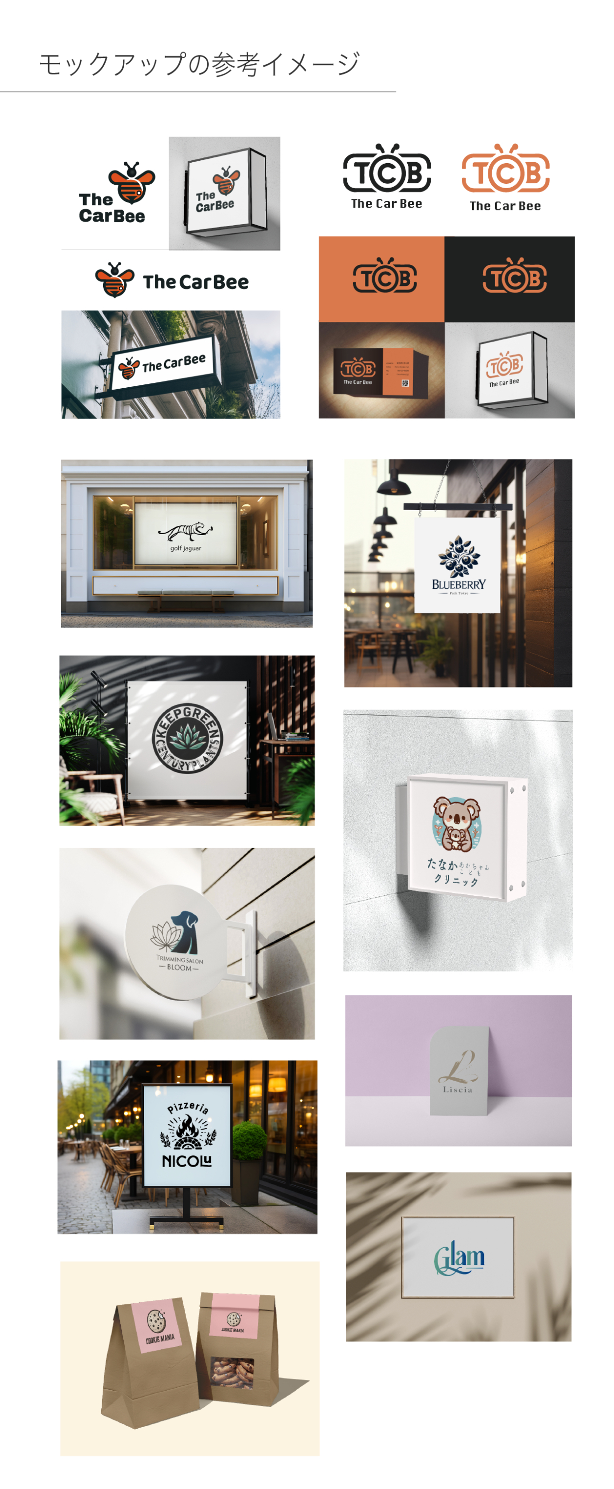 ワードロゴ / フェムテックサービスロゴ / カフェロゴとモックアップ / 動物・植物・モチーフロゴ / ロックバンドのロゴ / ビジネスロゴ / モックアップの参考イメージ