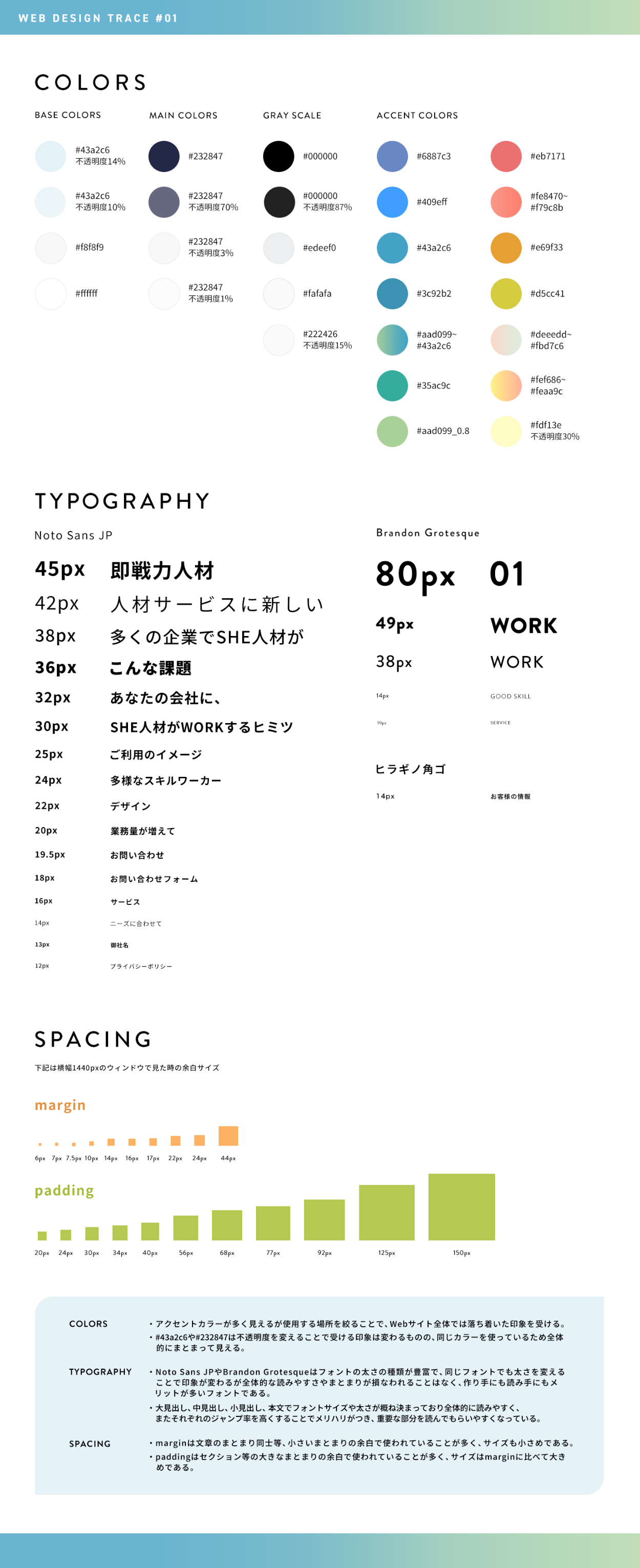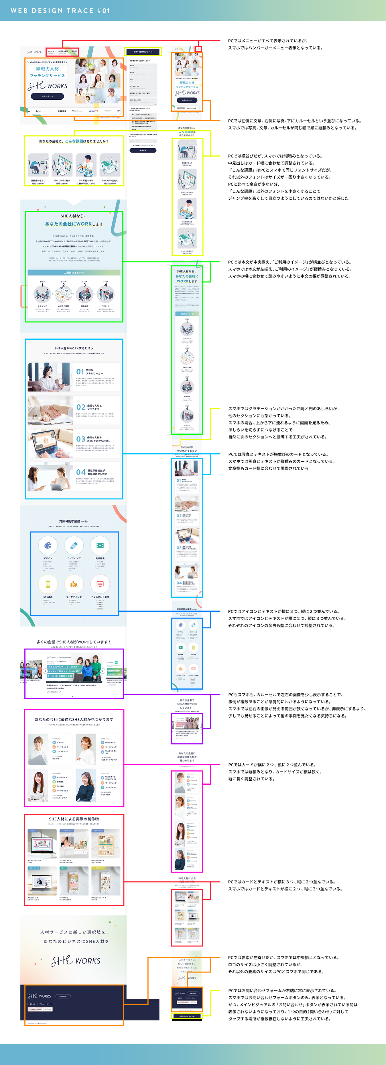 SHElikes MULTI CREATOR CORSEの課題で、LPトレース課題に取り組みました。デザインガイドラインの作成と、PCとスマホで異なるデザインやレイアウトの分析を行い、分析結果をまとめました。(制作期間:約2週間、所要時間:約20時間)