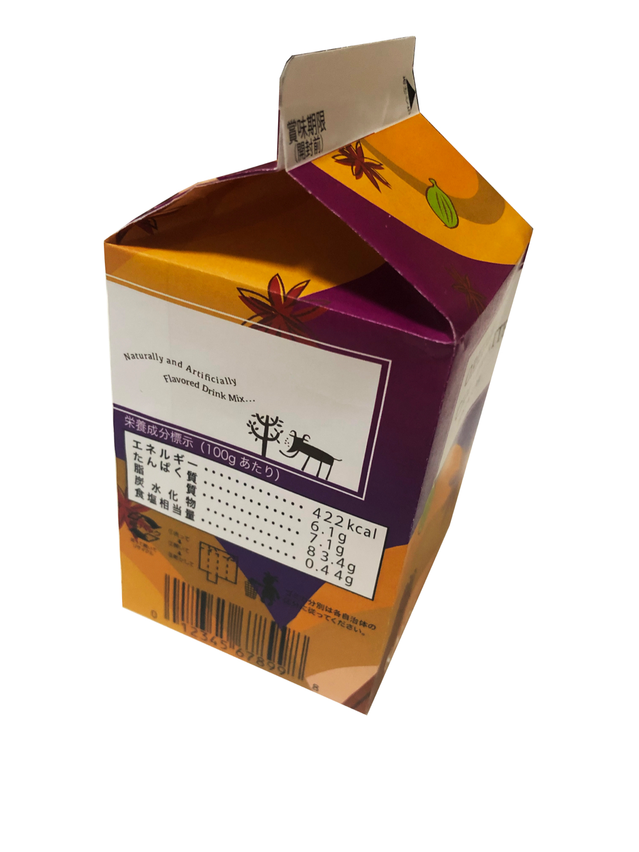 背景を鮮やかなパープル×チャイラテそのものをイメージしたオレンジの渦を施し、海外輸入の商品のようなエキゾチックさを出しています。また、デフォルメしたスパイスのイラストを散らすことでポップな印象にしました。タイトルをラベルシールで貼ったようにすることで、デザインに奥行きを持たせてみました。
