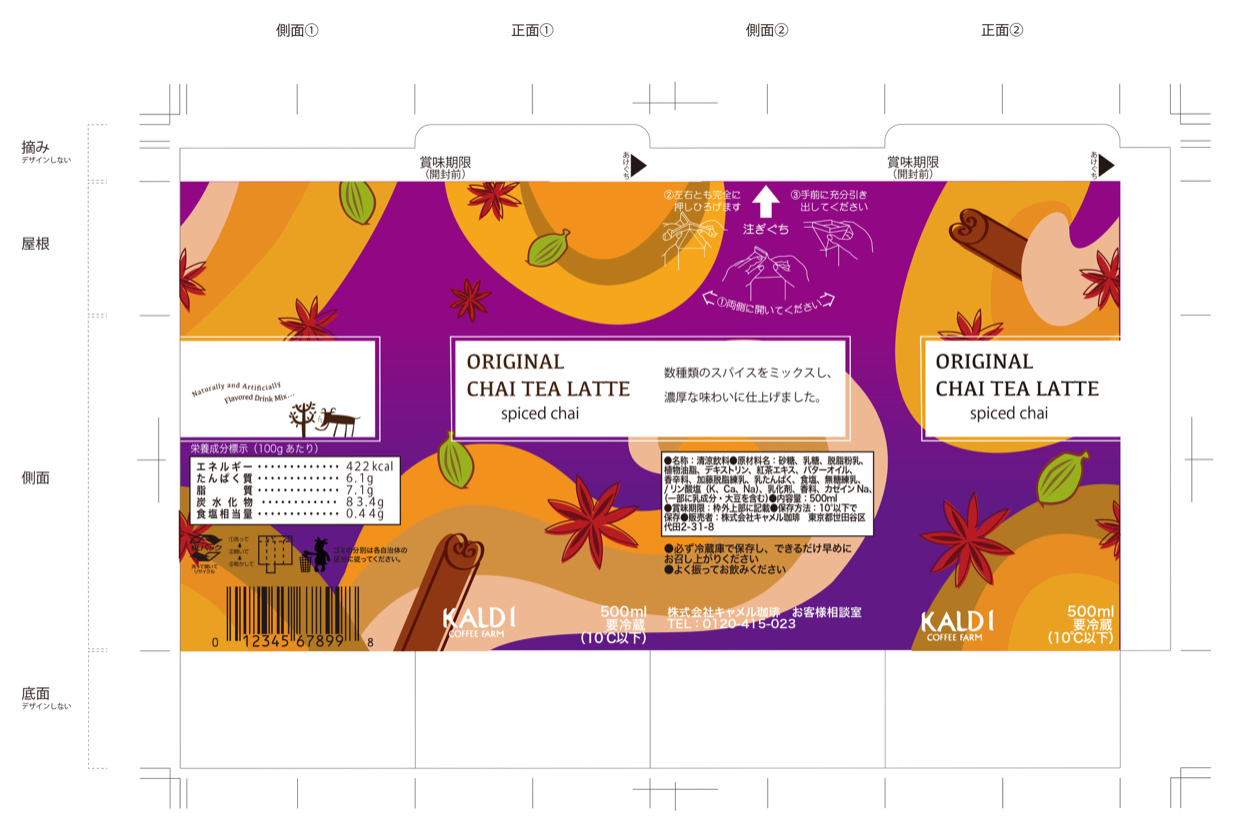 立体物・パッケージデザインのデータ制作演習と商品企画マーケティングの演習として、コンビニ等で販売するチルドドリンクの商品企画とパッケージデザインをしました。何の飲料で、誰をターゲットにするのかを自分で設定できる課題だったので、私はカルディに置いてありそうなチャイラテを選びました。ターゲットは10~30代の女性にしています。