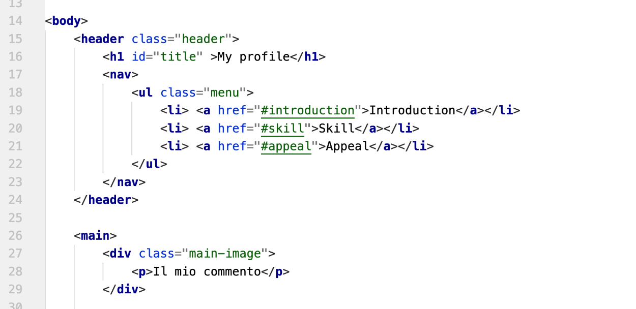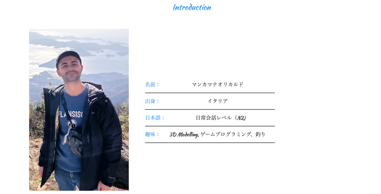 Wep page Manca Matteo プログラマー OVERVIEW CSSとHTMLでWebページを作成する。 Webページの先頭には、小さなメニューとプレゼンテーション画像があります。そのあと、私が自己紹介をする小さなセクションがあります。Webページの最後には、「スキルとアピール」のセクションがあります。