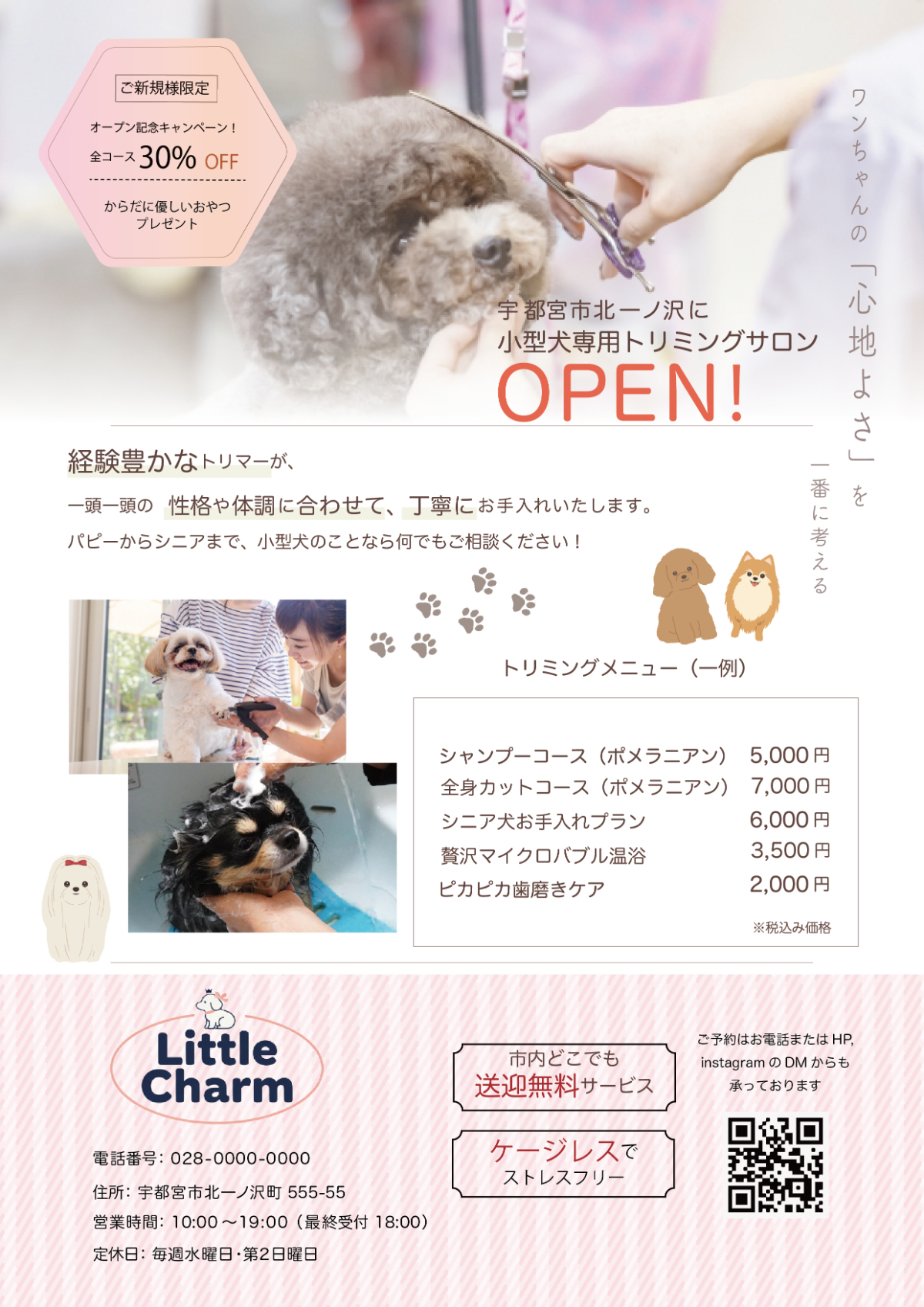 【自主制作】ペットサロンオープン告知チラシ hico グラフィックデザイナー / ライター 架空案件|ドッグサロンの開店告知チラシ(A4) ターゲット:近隣に居住する小型犬の飼い主 意識した点:小型犬専用の安心感を伝わりやすくすること 使用ツール:Illustrator / Photoshop