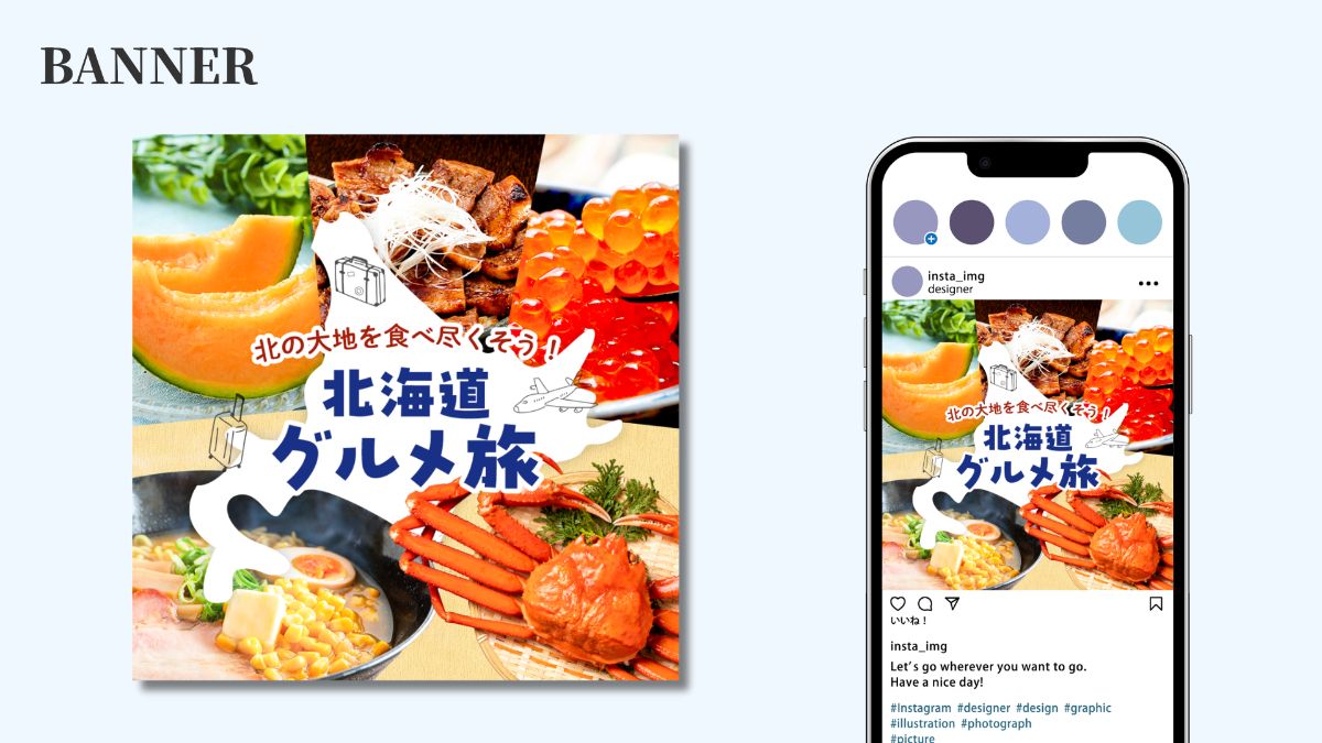 20〜30代の女性向けに、「食」をテーマとした北海道旅行への集客を目的としたInstagram広告の作成を行いました。『北海道旅行で食べたいグルメ』をテーマに企画立案からデザイン(バナー制作)まで行いました。