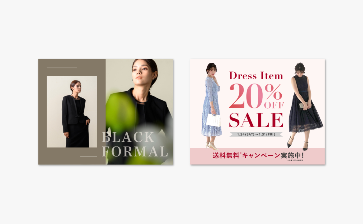 右のパーティードレスのバナーでは、いちばんアピールしたいセール情報の文字を大きくし、2番目に強調したい「送料無料」の部分は帯を引きました。全体的に抑えめなデザインながらも、文字の大きさやグラデーションの部分使いでメリハリをつけています。