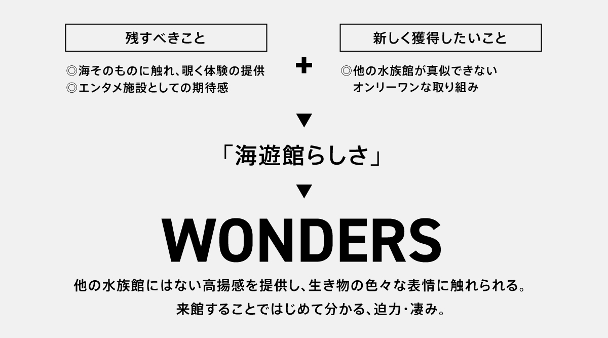 従来のWEBサイト制作のような情報設計から入るのではなく、課題をクリアするためにはブランド価値をしっかり定義することが重要と考えました。方法としては、既存のブランド強化(求心力)と既存の枠を超えたブランド強化(遠心力)の2つの力学が必要なため、海遊館が「残すべきこと」と「新しく獲得したいこと」の要素をワークショップで抽出し、コミュニケーションコンセプトを開発しました。