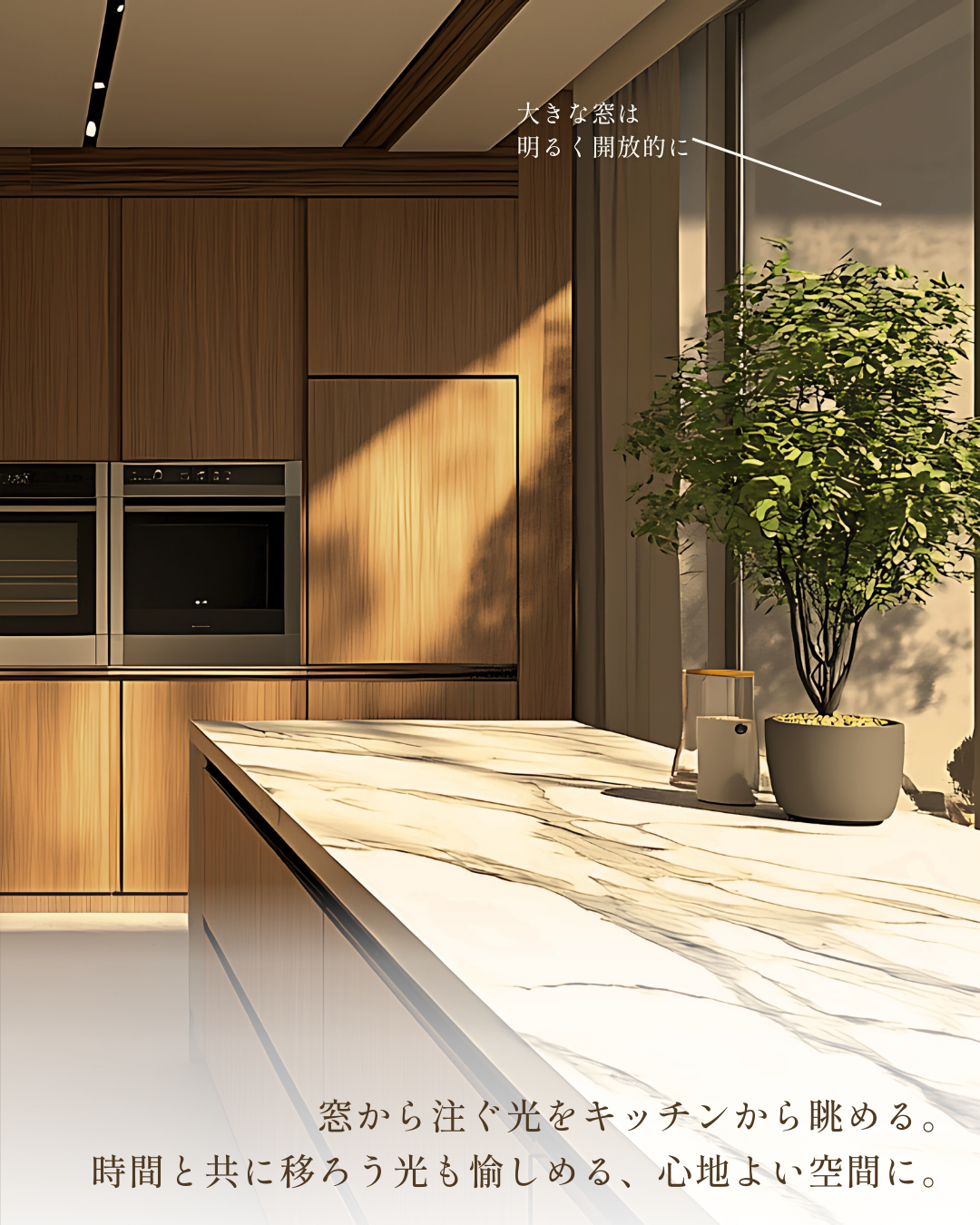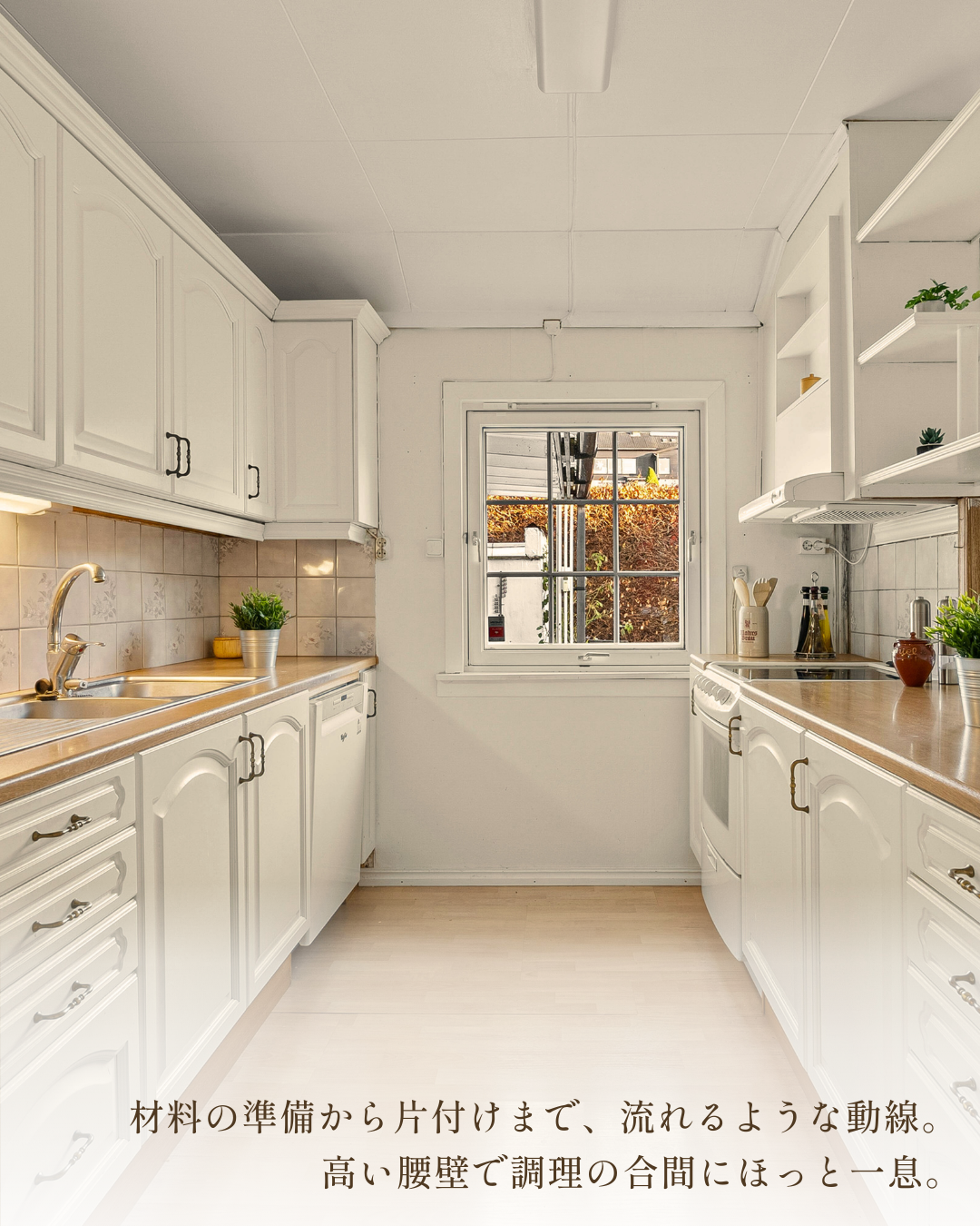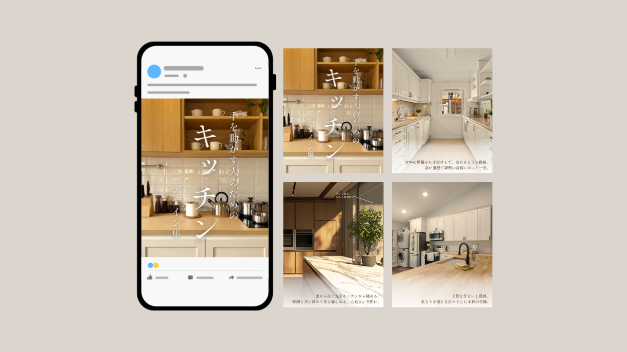 - 上質なキッチン空間を構成する要素(光・動線・素材)に着目し、キッチンに差し込む光や、出し入れのしやすいカップボード、使い勝手がよく、広々とした木のキッチンなどを軸に、憧れや心地よさが伝わる投稿構成を意識して制作しました。