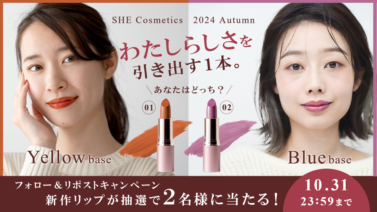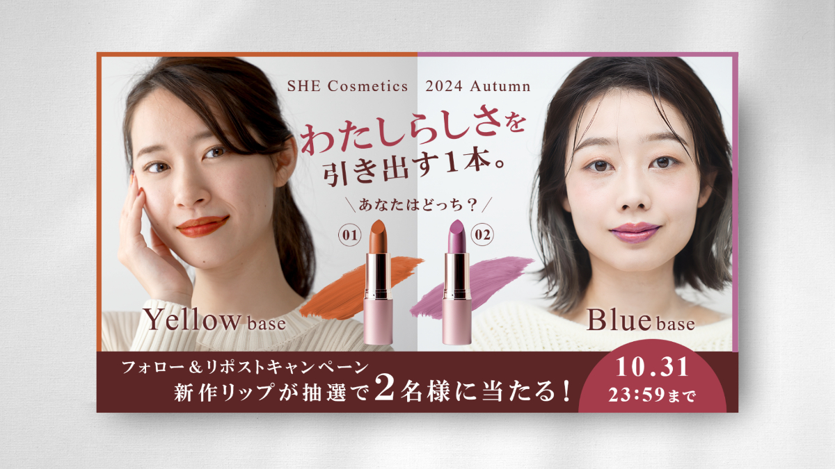 架空のコスメブランド「SHE Cosmetics」の Xアカウントフォロー&リポストキャンペーンバナーとして制作しました。