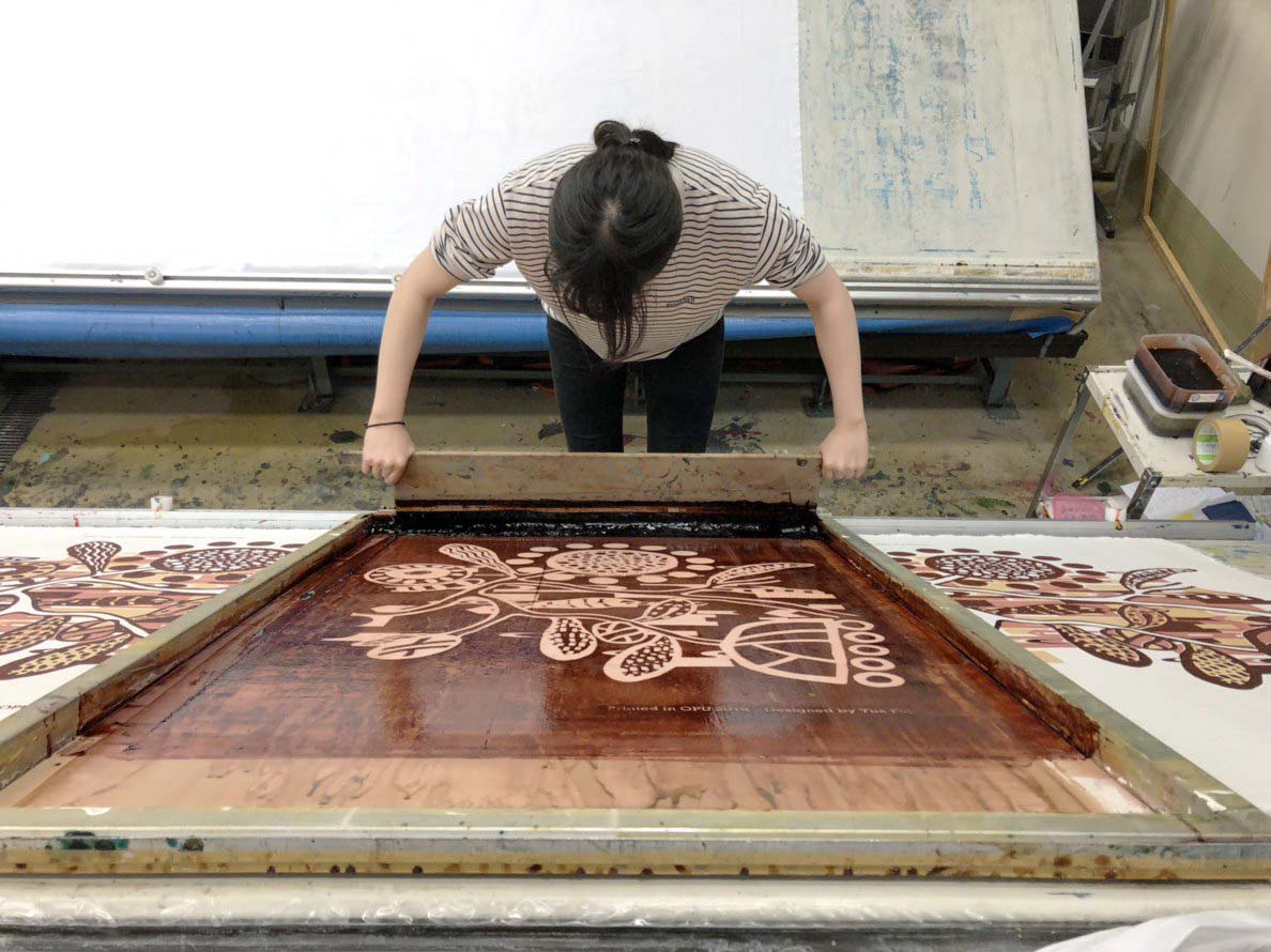 絵の具で出した絶妙な色味を反応染料で表現する為、妥協せず、色づくりに多くの時間を割きました。結果、希望に近い色を作ることができ、柄がずれないよう捺染し、色を定着させる為蒸した後、乾かして完成です。
