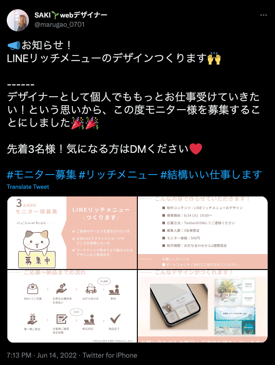 個人でのお仕事の幅をもっと広げていくため、Twitterにてモニター募集を行いました。