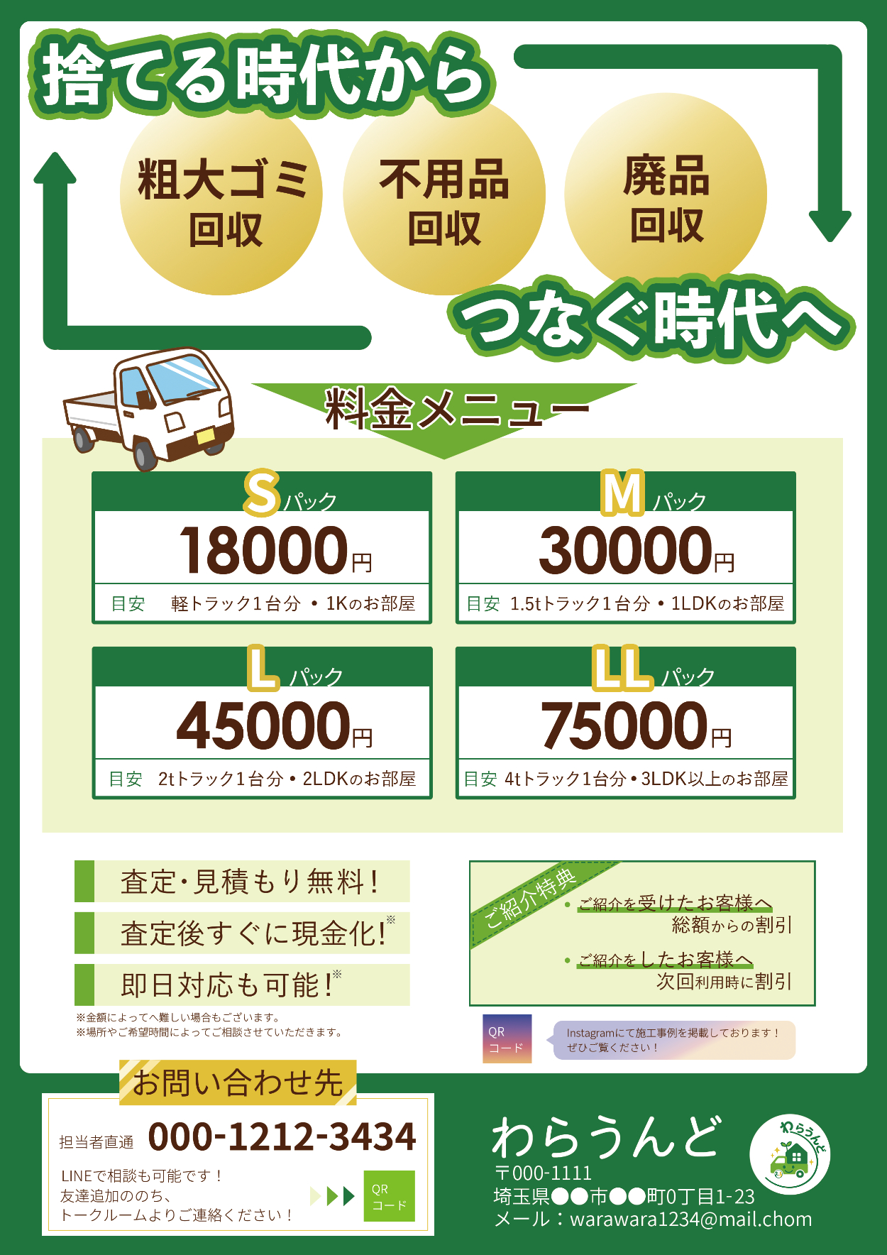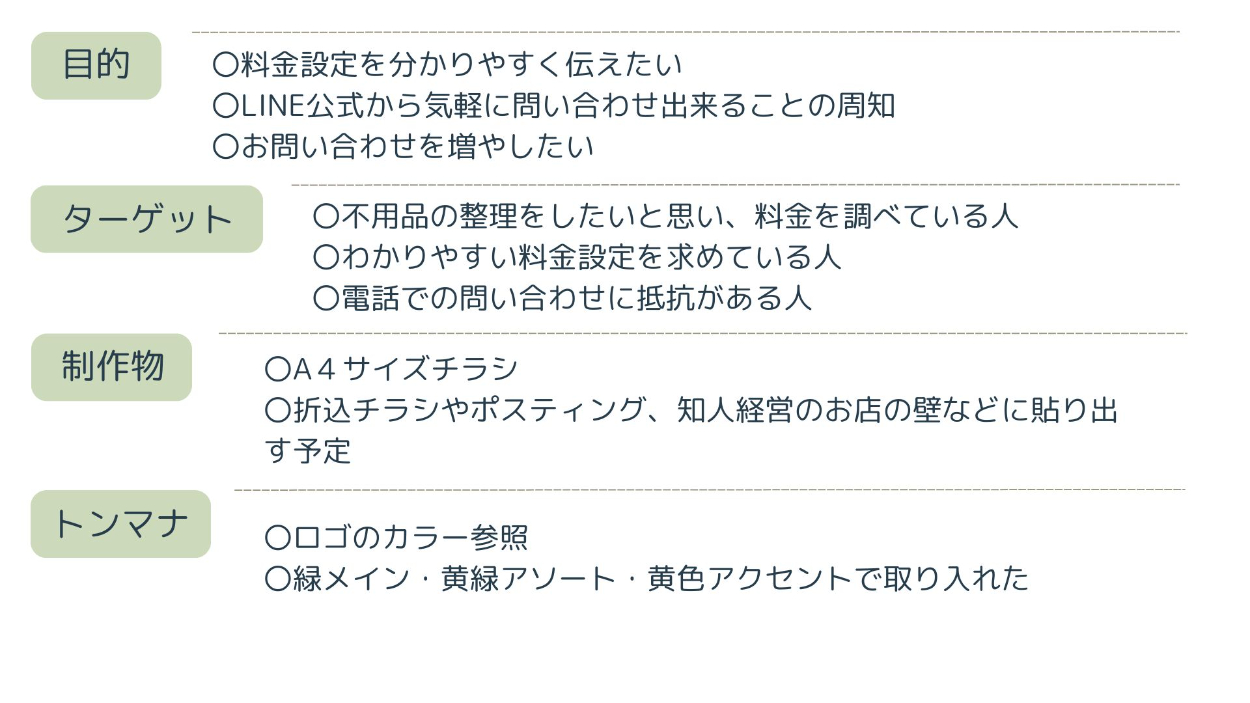 【実案件】チラシ:わらうんど様 Kino webデザイナー OVERVIEW #チラシ#不用品回収#緑 YEAR 2025 〖制作物〗〖要項〗〖制作物について〗〖制作時間〗参考探し・レイアウト:2時間 デザイン・修正:7時間〖制作ツール〗Photoshop