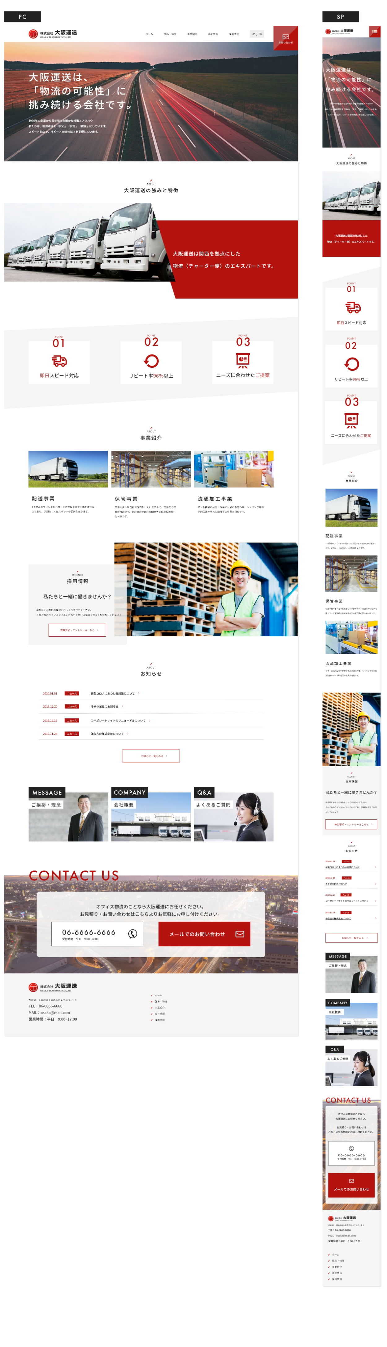 白を基調としたサイトながら大阪運送様のテーマカラーである赤を差し色として使うことで、大切な情報を強調するようにしました。赤の持つ「スピード」「挑戦的」というイメージを訴求しております。