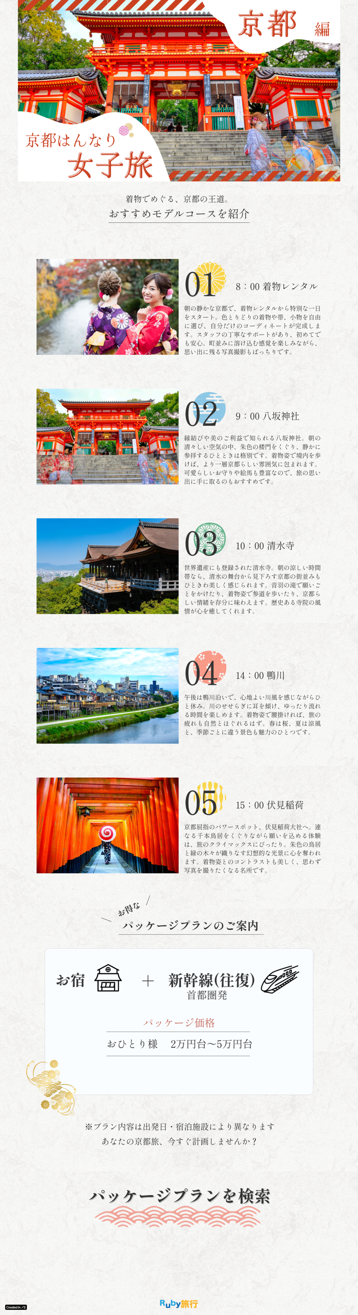 【HerTech架空案件】Ruby旅行、「京都はんなり女子旅 おすすめモデルコース」首都圏発の新幹線(往復)+お宿のパッケージプラン販売LPを作成いたしました。