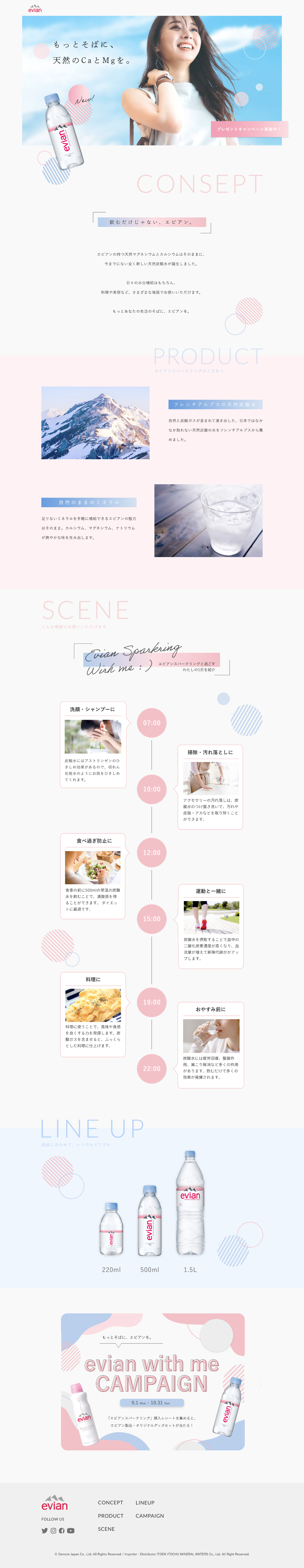 エビアンから炭酸水が新登場した際のキャンペーンサイト。 「エビアンらしさを生かす」「もっとそばに寄り添う」という2点をコンセプトに制作。 ただ使用場面を見せるのではなく、タイムラインを使うことでイメージが沸きやすくなるように工夫した。