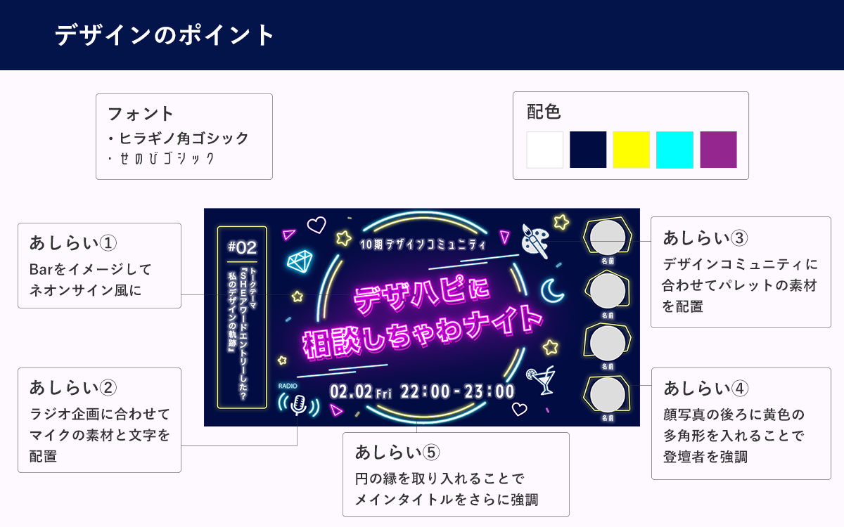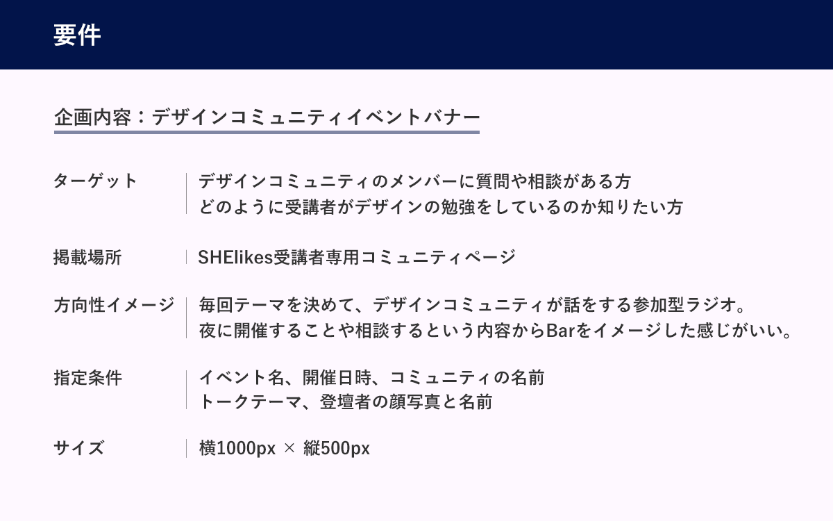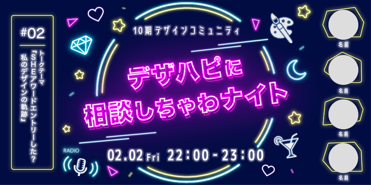 女性向けのキャリアスクール「SHElikes」内の「デザインコミュニティ」イベントバナー。 制作時期:2024年1月 制作期間:3日間 使用ソフト:Illustrator