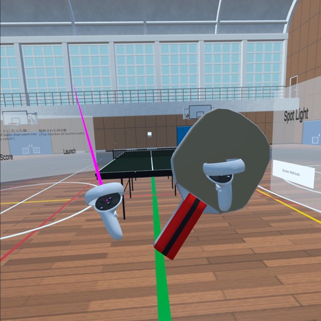 - VR卓球場にはコーチのお手本用ラケットや、大画面で動画を見ることのできるシステム、点数管理システム、応援するチアリーダーなどを配置した