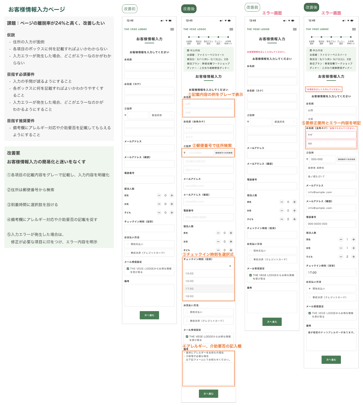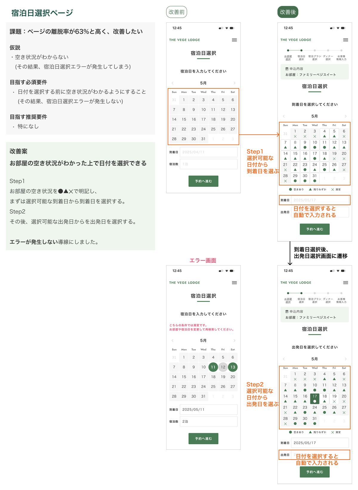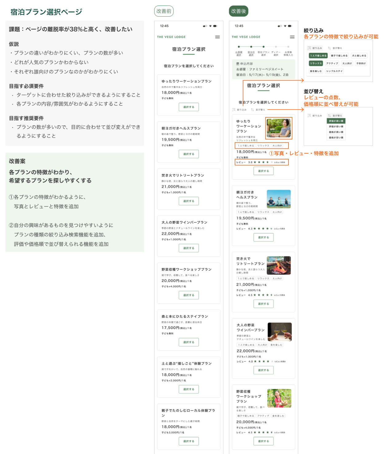 SHElikes Pro デザイナー 6つ目の課題。宿泊施設の予約率改善を目的として、離脱率が高いページの離脱要因の仮説を立て、改善方法を提案しました。
