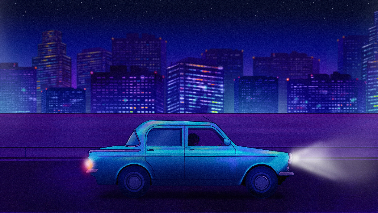 テーマカラーを紫にし、80年代のようなエモーショナルなイラストに仕上げました。アニメーションをつけるためPhotoshopでレイヤーを分けて作成しています。