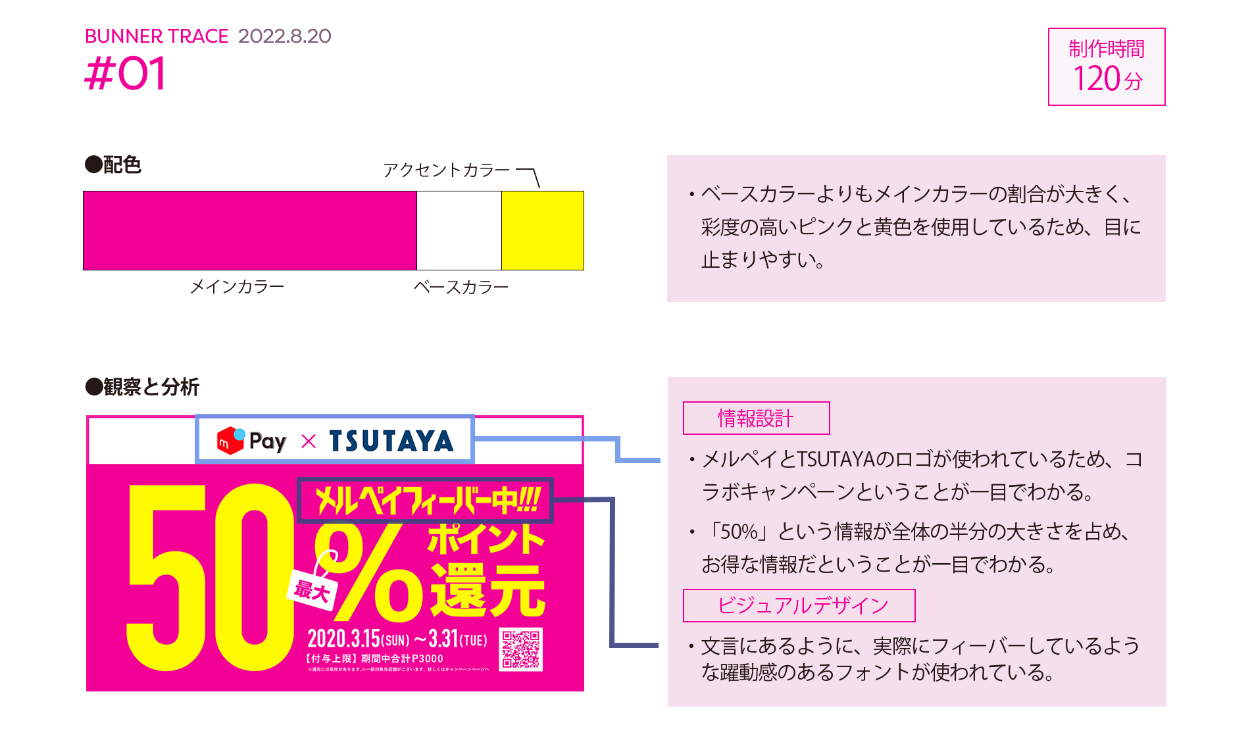 基本的なことですが、バナーはWebサイトの中でも決して大きくなく、ともすれば全く気にかけられずスクロールされるほど小さいものですが、バナートレースを経て、その小さな作品の中に製作者の伝えたい意図、メッセージがあり、細部までこだわって作り込まれていることがわかりました。