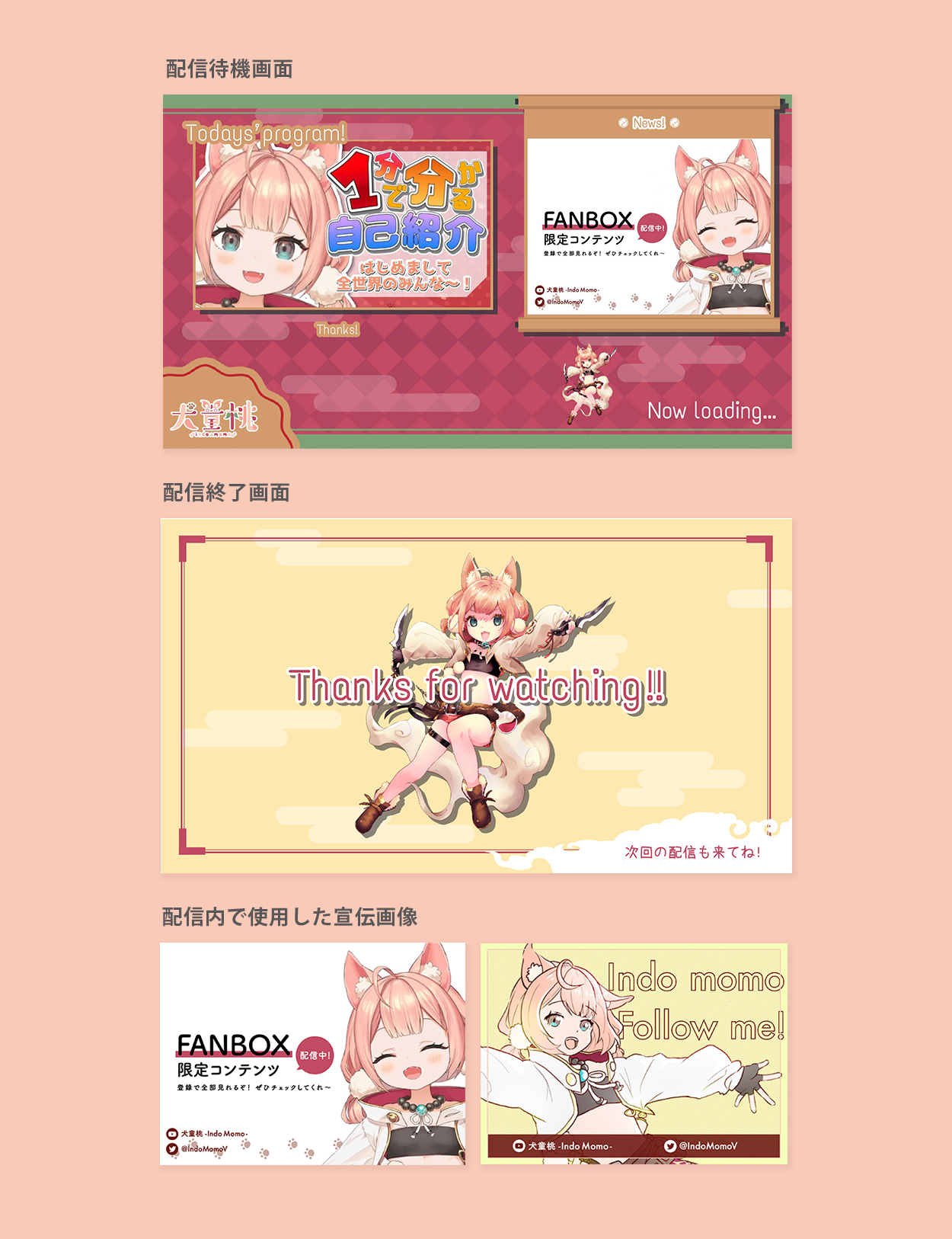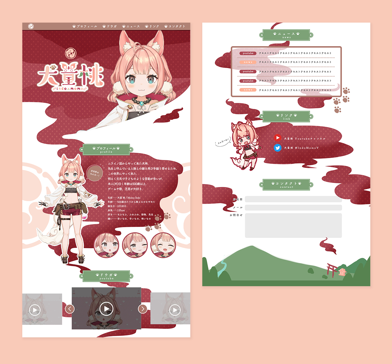 犬童桃さんは、かわいらしい見た目や声と共に、意味深な発言をするキャラクターです。その世界観を表現するため、丁寧に打ち合わせを行いながら、ページ全体を通してかわいらしいデザインを取り入れ、背景には天界から地上へ犬神の魂が降りてくる様子を表現しました。残念ながら犬童桃さんのYouTube活動が休止となったため、このWebサイトは公開されませんでしたが、デザインにはご満足いただけたようでした。