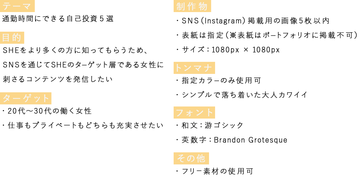 女性向けキャリアスクール SHElikes様のInstagramに投稿するコンテンツのクリエイティブを制作しました。要件、情報設計、デザインポイントにまとめています。[制作期間:7日 使用ツール:Photshop]