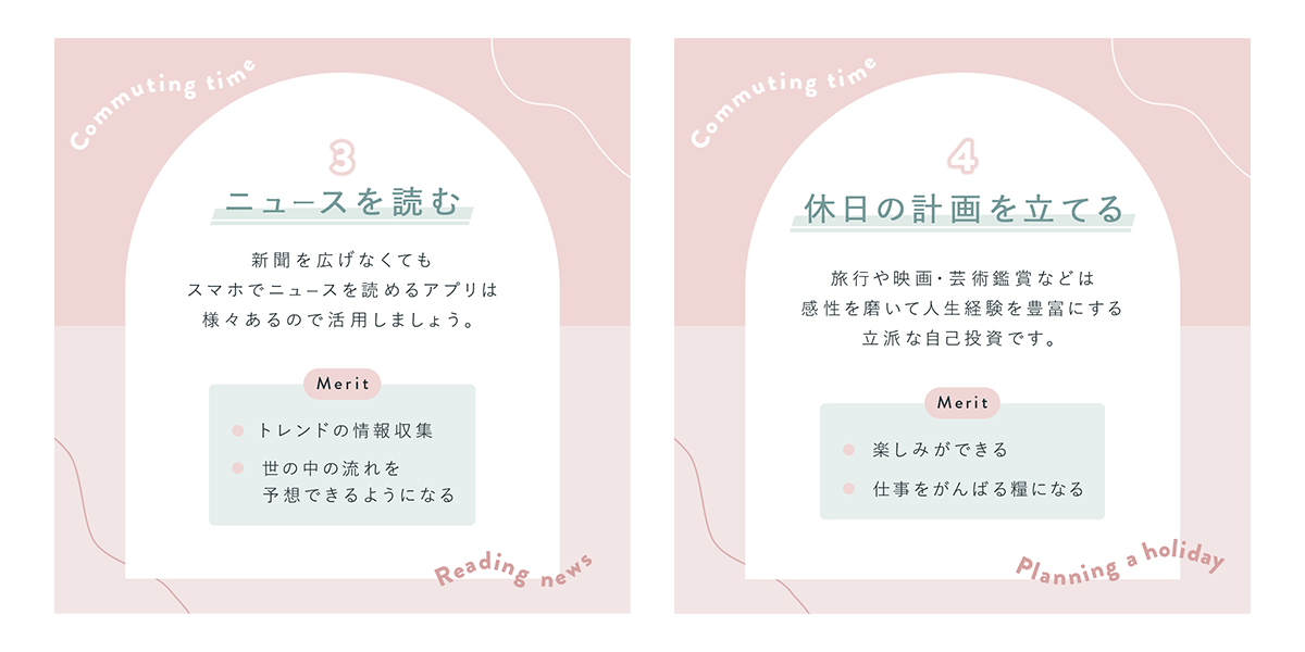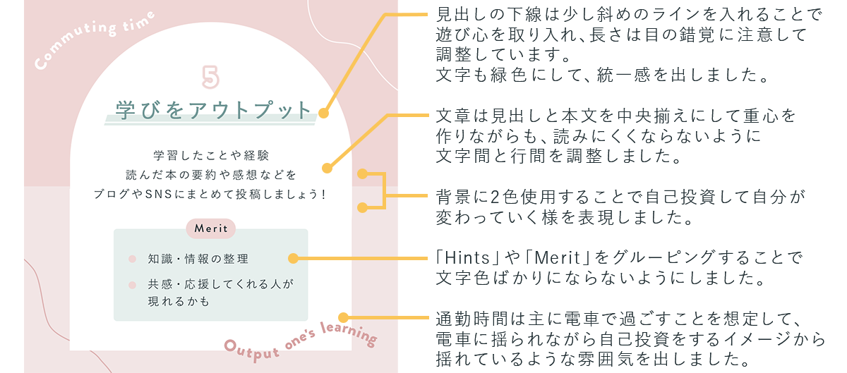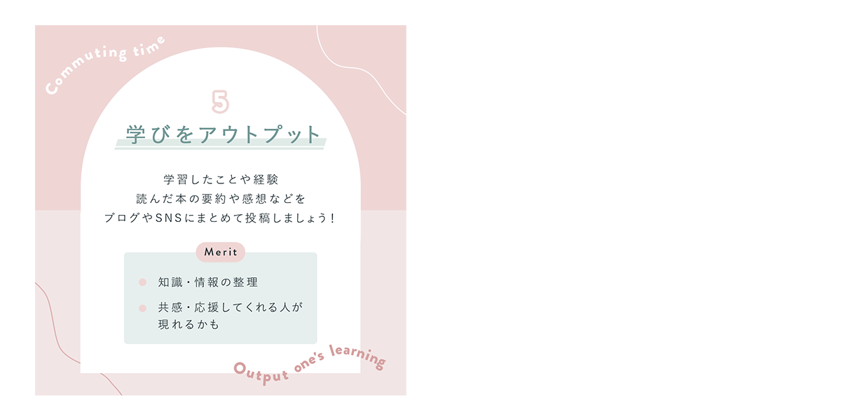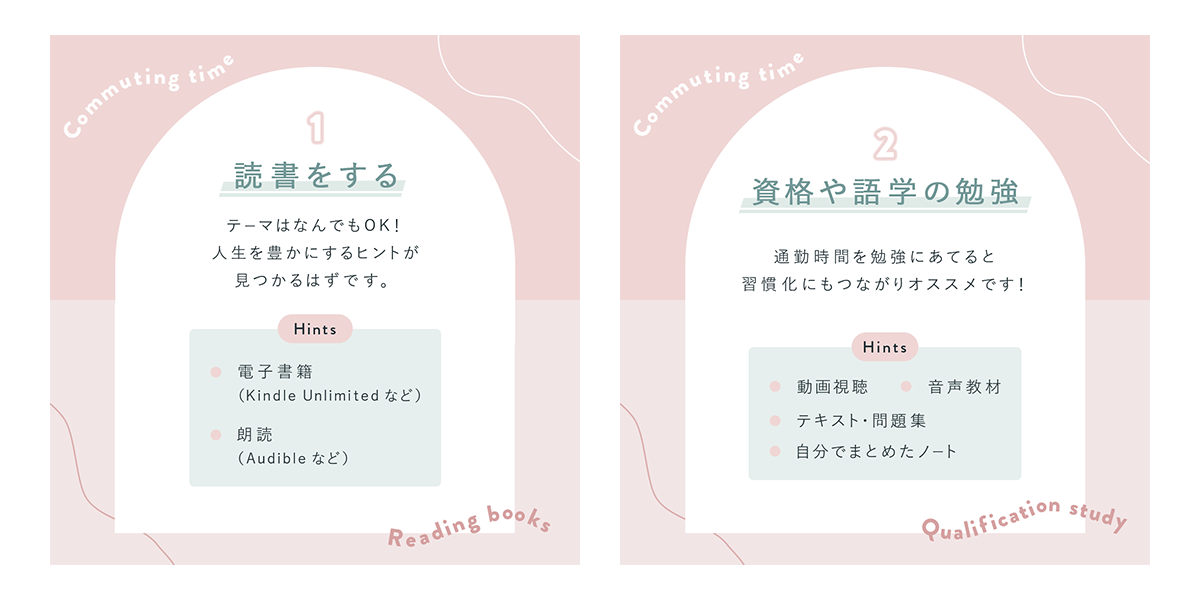 - 通勤時間は毎日あり、その時間を無駄にせず自分を成長させるための習慣作りとなるように日々続けられること