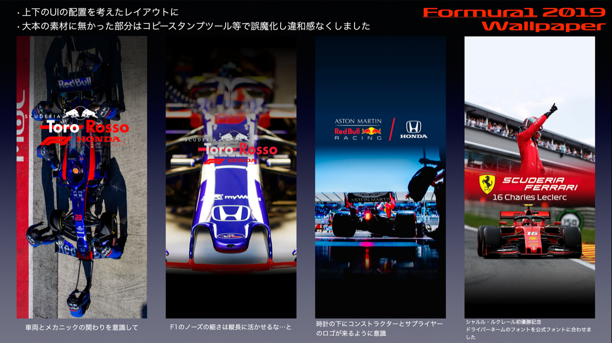 F1 2019 iPhone X 壁紙ほか Ryo Shibata 転職活動中です OVERVIEW 他、作成した壁紙のまとめ YEAR 2019 実際に設定した際のバランスを考えてレイアウトを作成、実機確認にAirdropが大活躍でした使用するフォントも公式での放送に近しいもので違和感を軽減複数画像のつながる箇所はチーム名とチームカラーのシャドウを入れて何とかしてみました