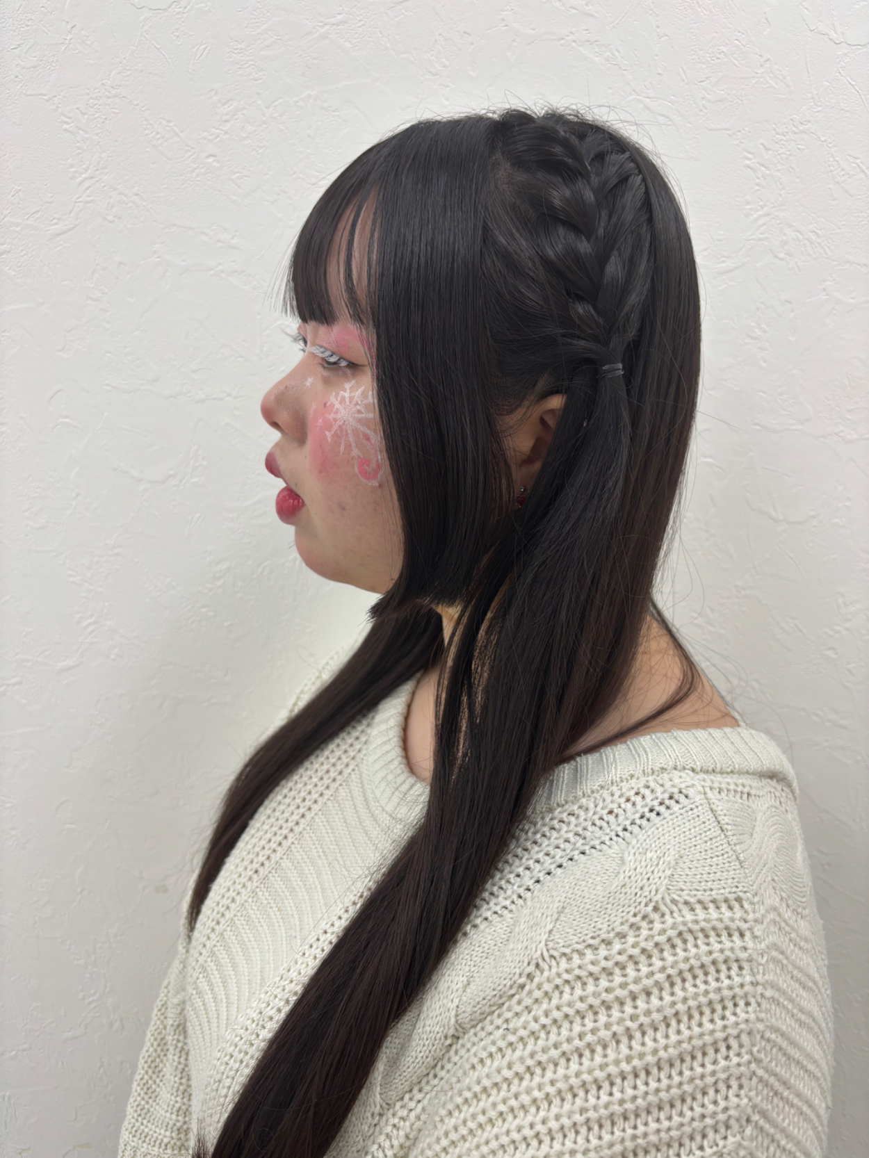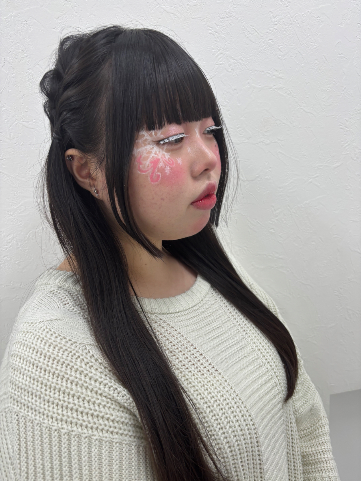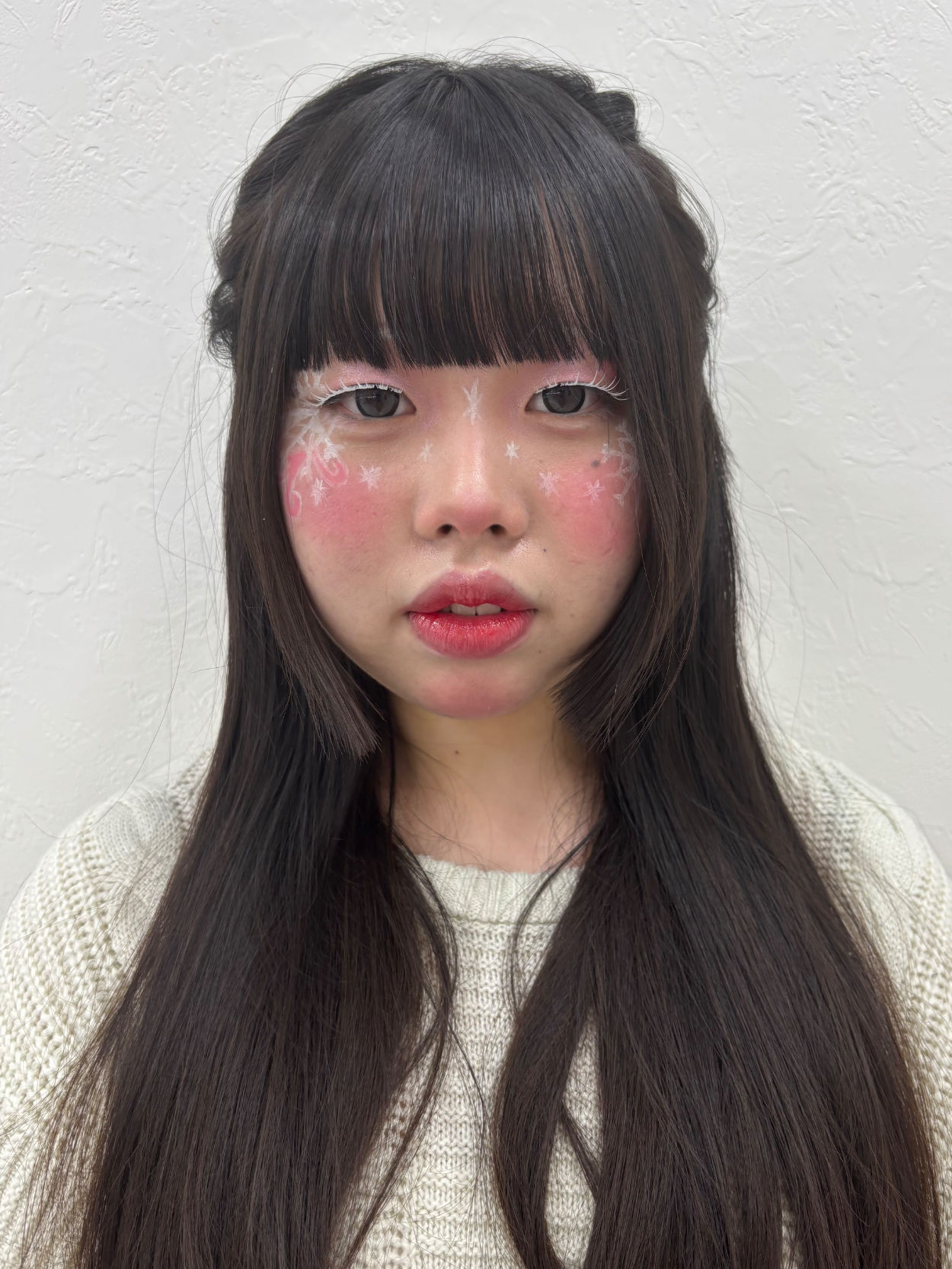 クリスマスメイク イイダ 専門学生 クリスマスメイクをしました。白いドーランを使用し、雪の結晶を繊細に描き、ピンクのチークで頬に温度感を加え、寒さの中にあるあたたかさを表現しています。ホワイトとピンクのコントラストで、冬らしい透明感のある世界観に仕上げました。