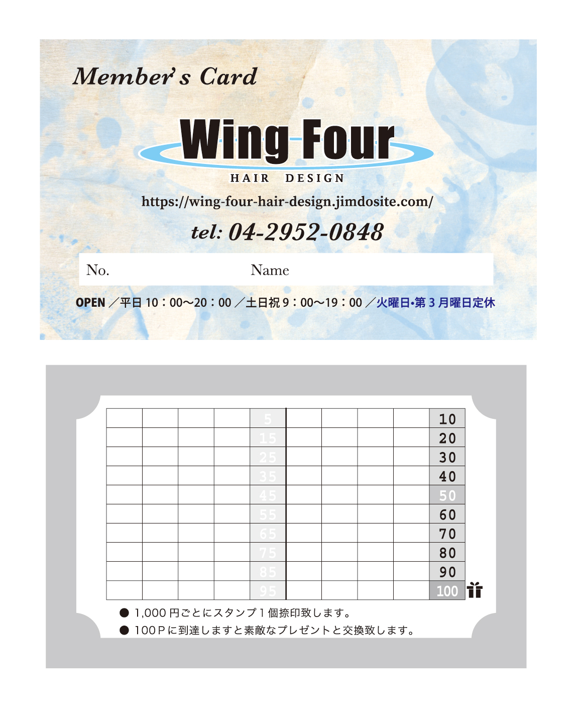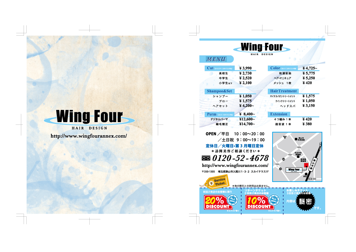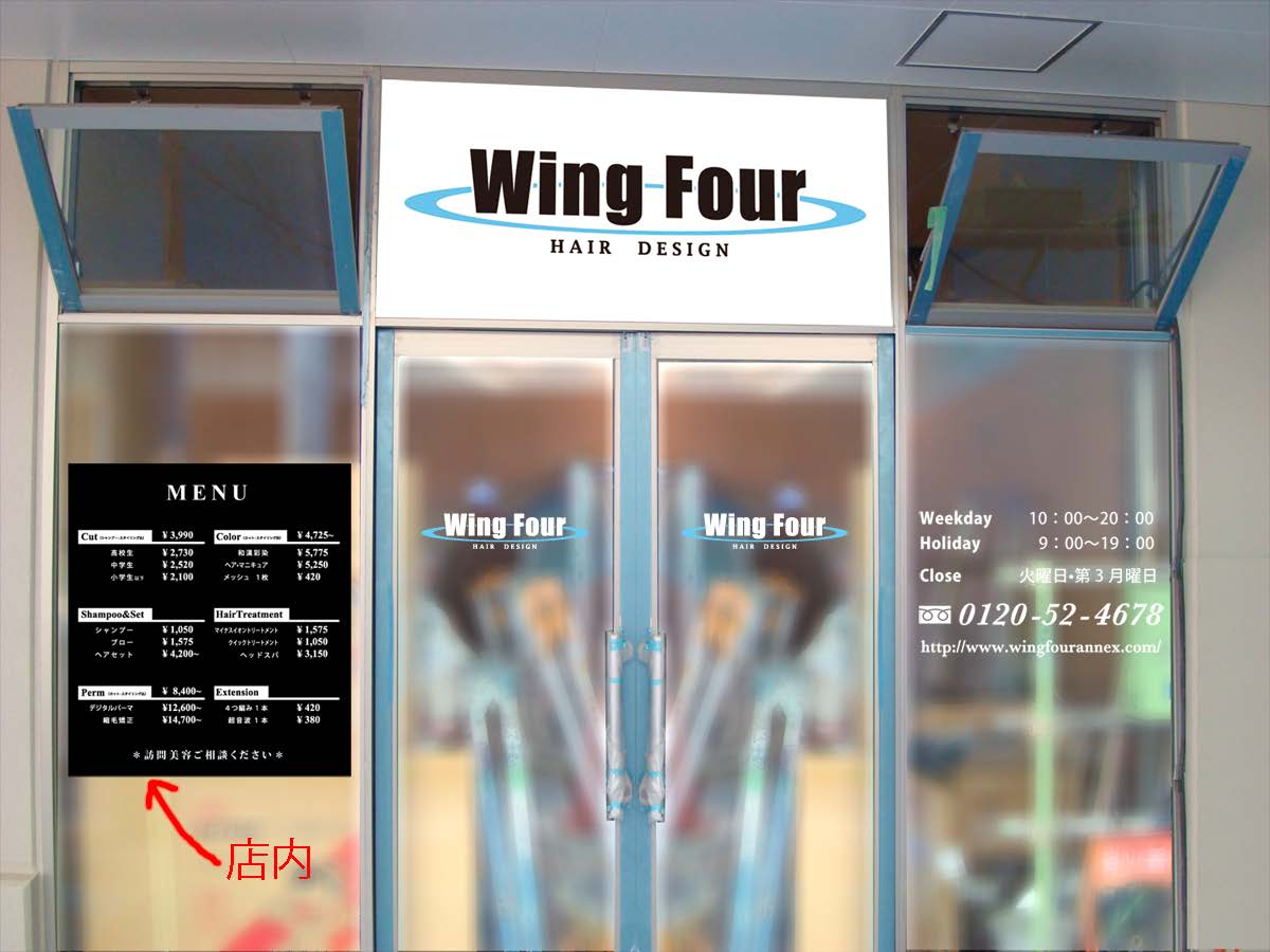 美容室Wing Four ロゴマーク制作から印刷物、内装外装企画デザイン iwashita yoshiko グラフィックデザイナー OVERVIEW リニューアルオープンの店舗のロゴ制作と内装外装施工、印刷物の作成まで