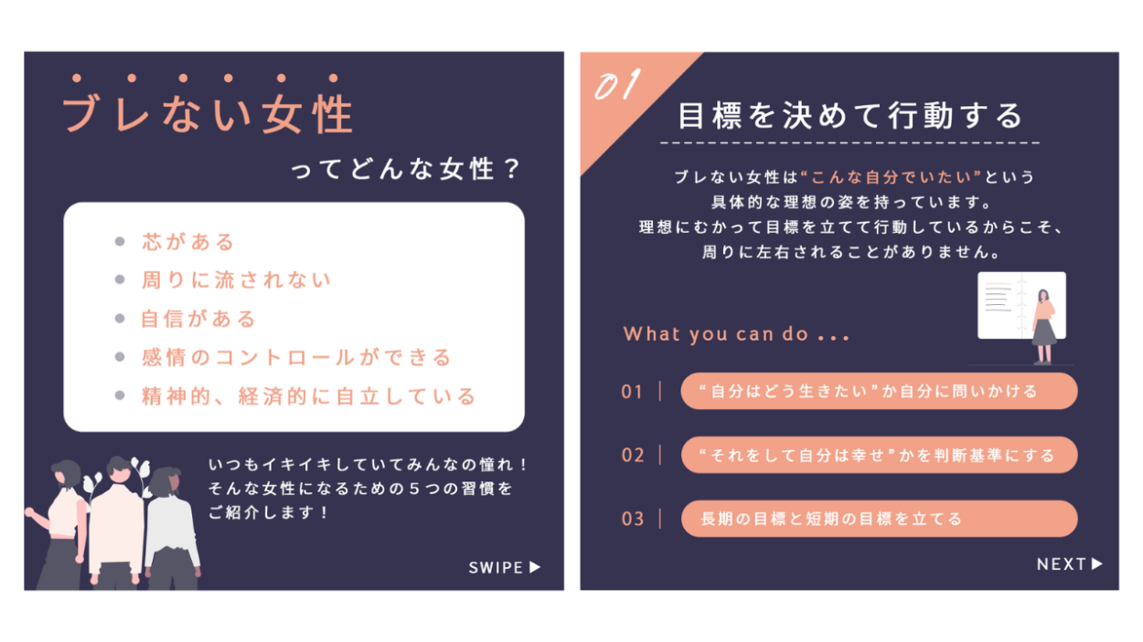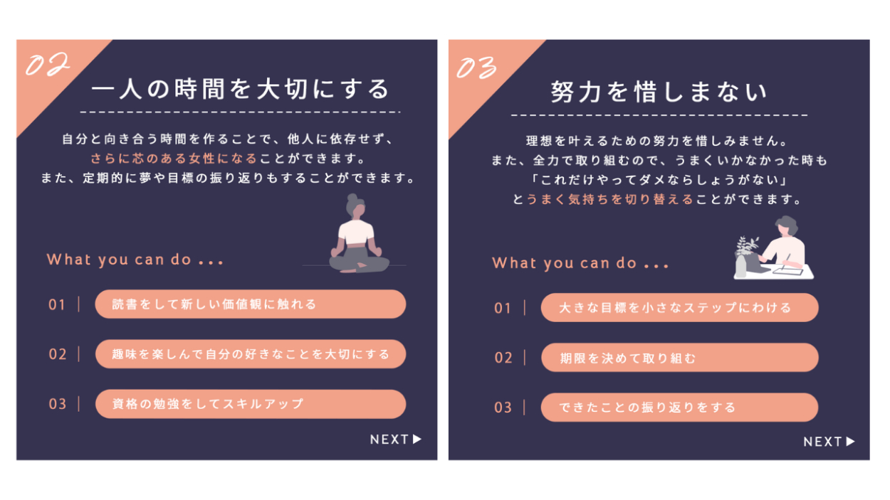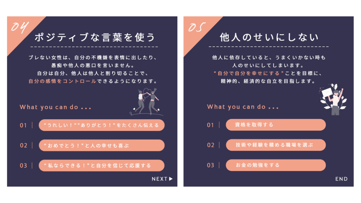 ・「ブレない女性って・・・」以外のページには同じ位置にイラストを置き、統一感を意識しました。また、イラストを入れることでイメージが沸きやすくなるように心がけました。