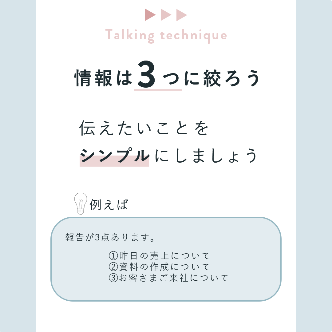 ・3ページとも上部にアクセントカラーのピンクで「Tallking technique」と置き、統一感を出しました。