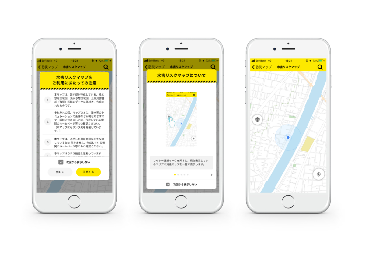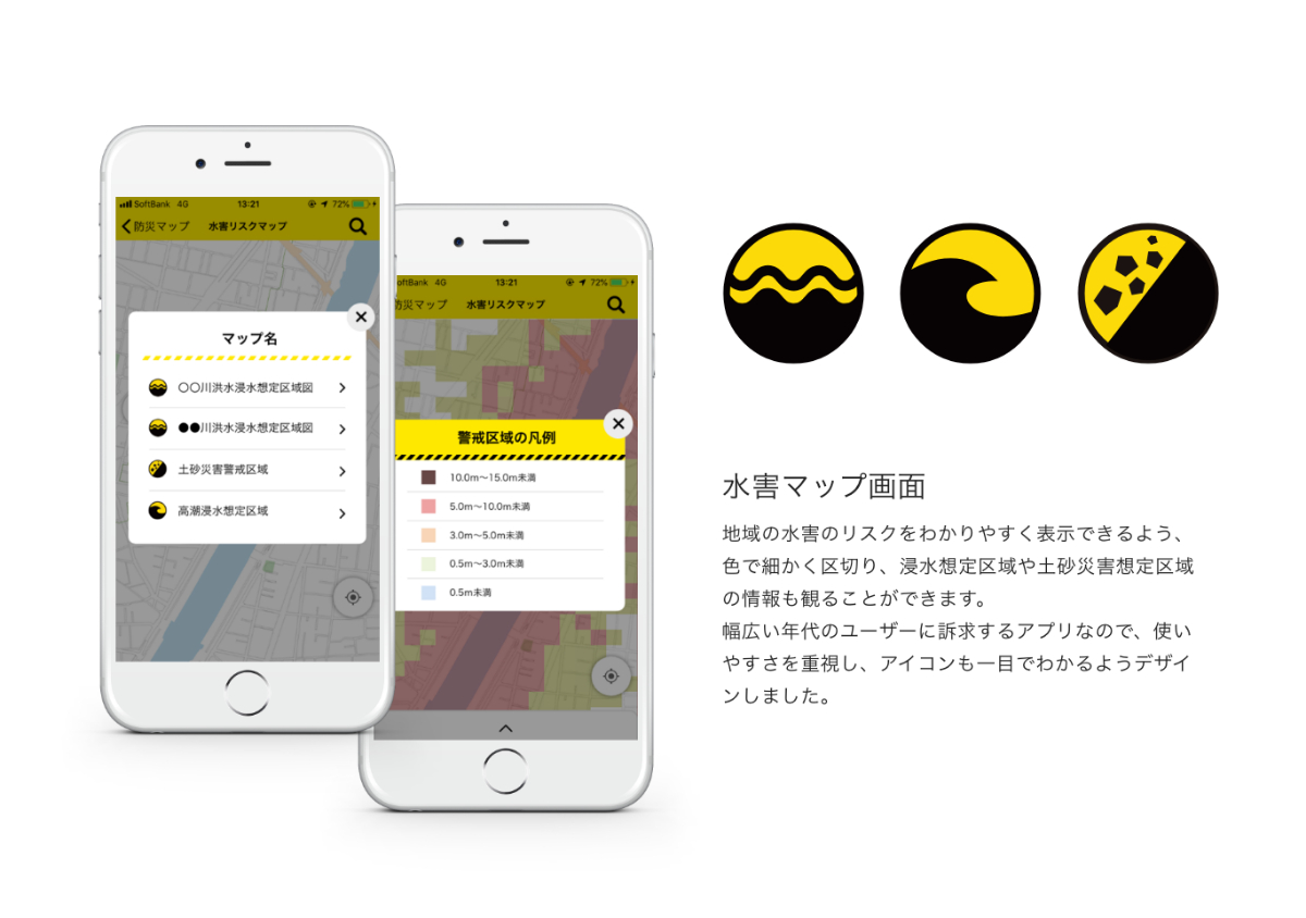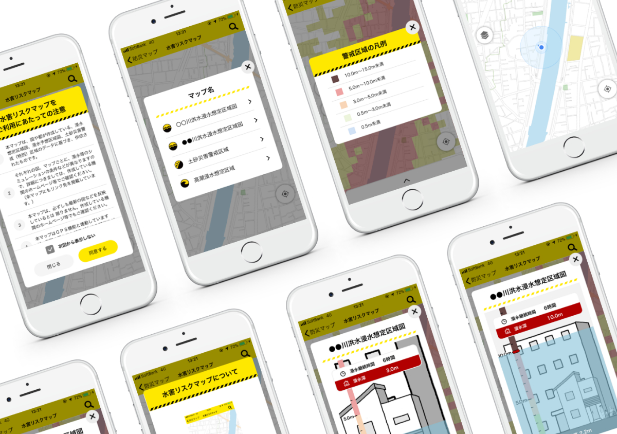 災害マップの新機能実装にあたり、地域の水害リスクを想定して表示する「水害マップ」のデザインとイラストをメインで担当しました。プロジェクトメンバーが作成したフォーマットデザインのトンマナを崩さぬように制作しながらも、より使いやすいデザインを考え、チームメンバーに提案しながら制作を進めました。