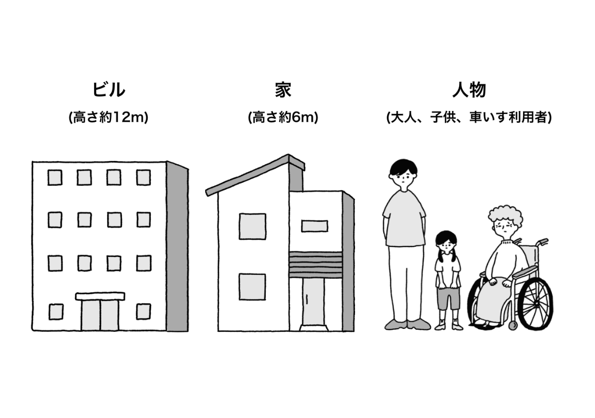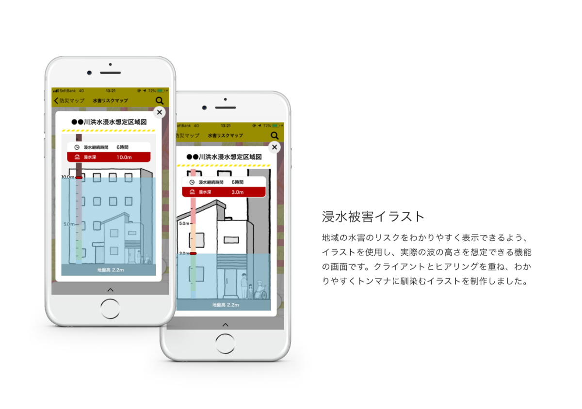 元々のアプリのテイストを崩さぬよう、シンプルなイラストを制作しました。浸水被害にあった時を想定しやすくするため、シンプルさを保ちながら、人物の頭身や建物の高さなどリアルな縮尺と同じように制作しました。