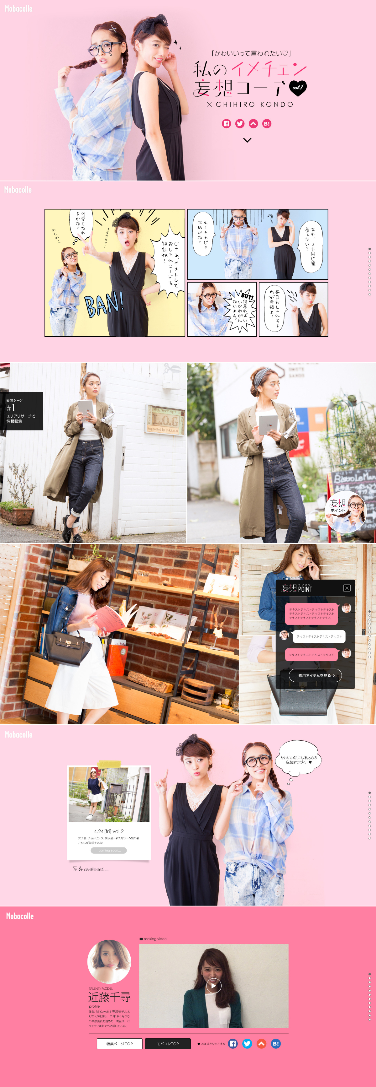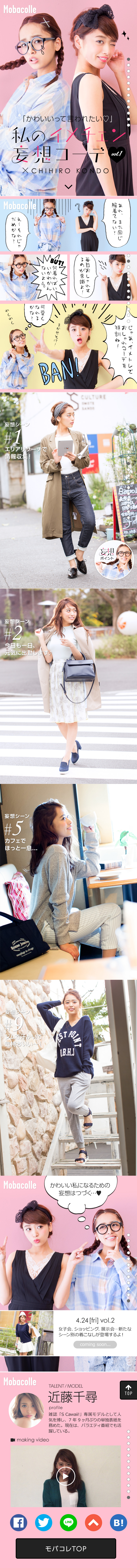 近藤千尋×Mobacolle コーディネート企画LP satoko Webデザイナー/ディレクター OVERVIEW プロジェクトマネジメント/企画/デザイン YEAR 2015 PCデザイン(コーディネート一部省略)SPデザイン(コーディネート一部省略) WEBSITE