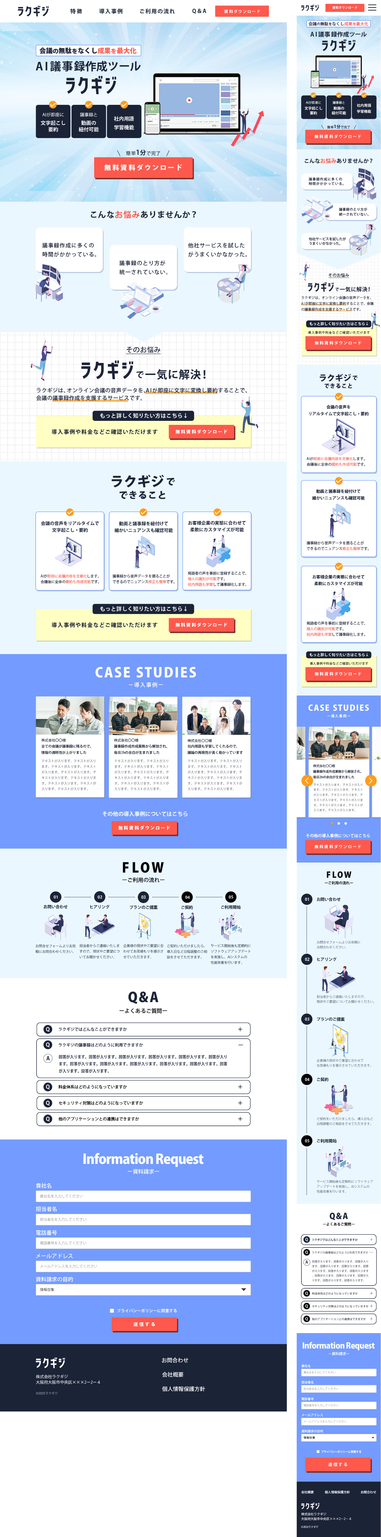 ファーストビューで「ラクギジ」のメリット・特徴を簡潔にまとめ、「ラクギジとは何か」「ラクギジで何ができるか」が一目で伝わるように工夫をしました。