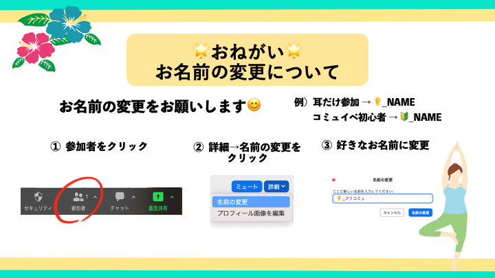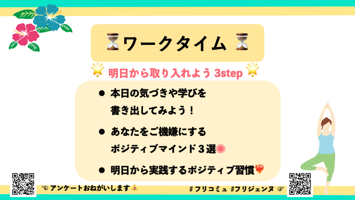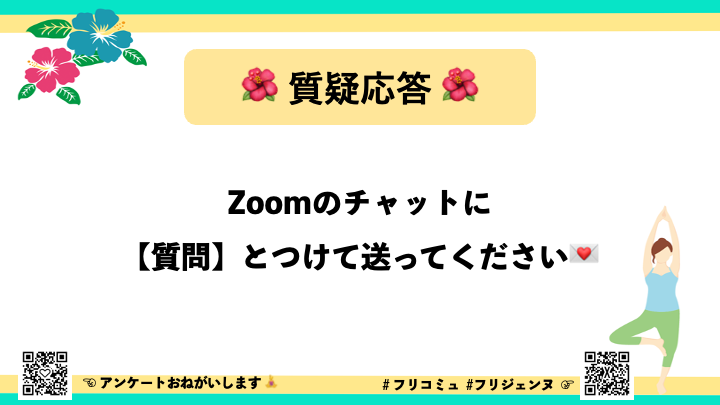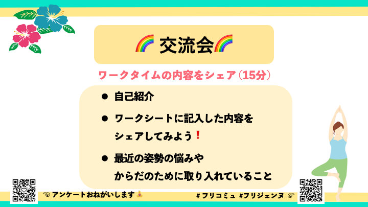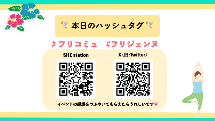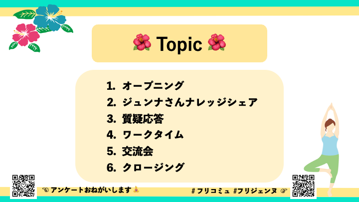 イベント登壇者が沖縄好きのヨガインストラクターの方でしたので、その方をイメージしてスライドをデザインしました。また、zoom開催するにあたってPC上でもみやすい文字を心がけました。 使用ツール:PowerPoint
