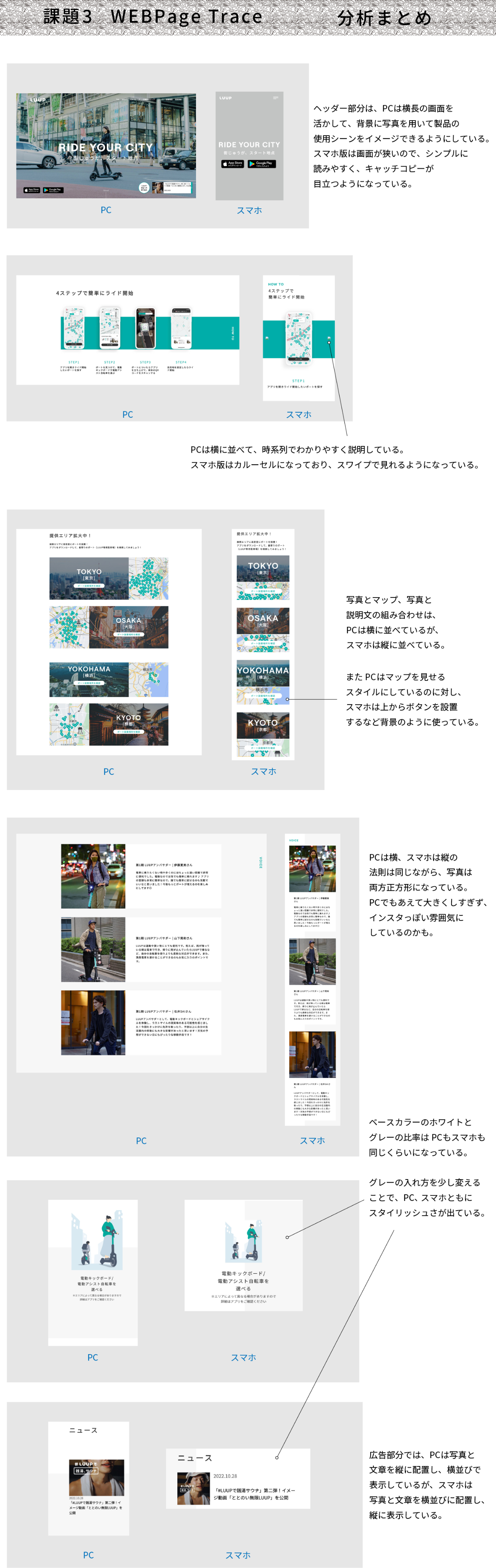 ・無彩色をベースにしているので、アクセントカラーが映える。アクセントカラーはLUUPの商品と同じようなカラーを使っているので、商品を連想させる演出が効果的にできていると思う。