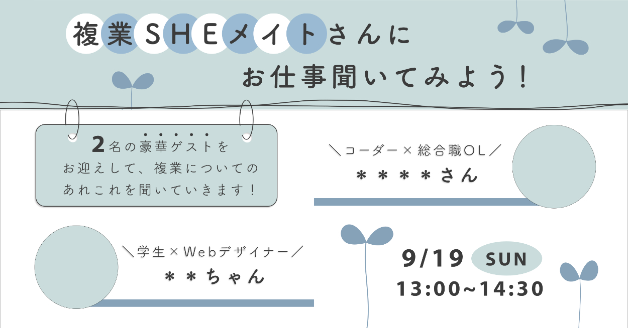 - シンプルなトンマナを保ちつつタイトルを目立たせるため、イベントのメインである「複業SHEメイト」の背景に色違いの丸を配置