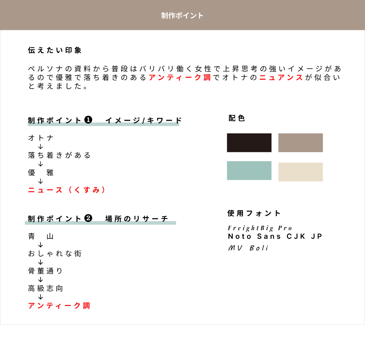 ①クライアントの目的を明確にするためには、事前に慎重なヒアリングを行うことが欠かせません。クライアントのニーズや希望を丁寧に掘り下げ、トンマナのイメージ設計を行う際には、その情報を基に適切な提案を行うことが重要で、より効果的で満足度の高い成果物を提供できるように心がけたい。