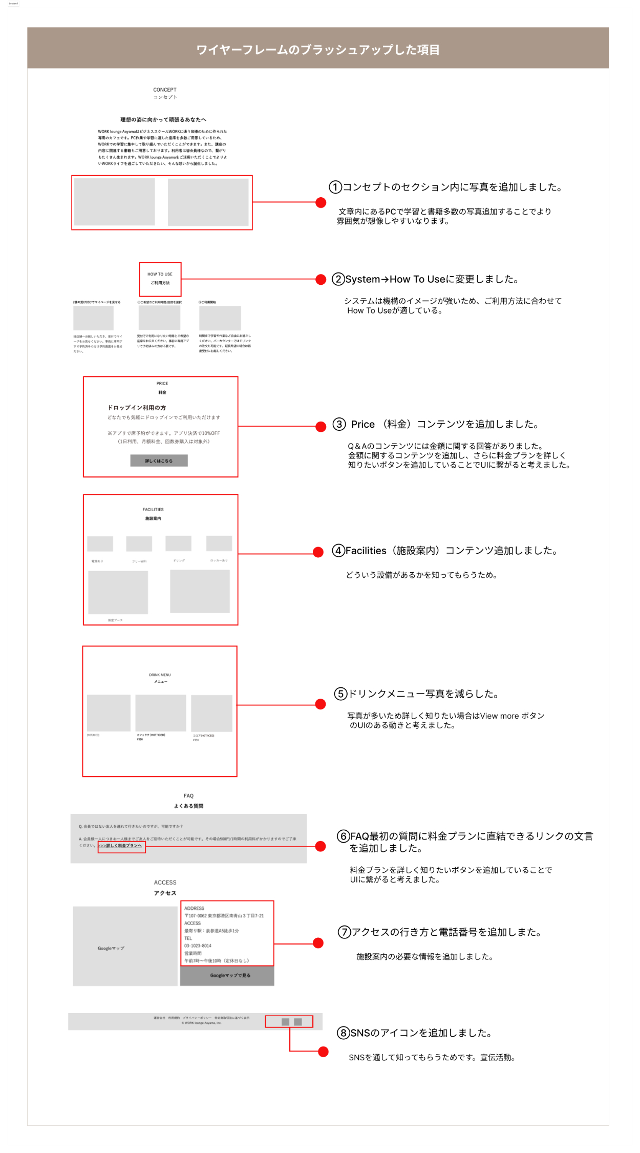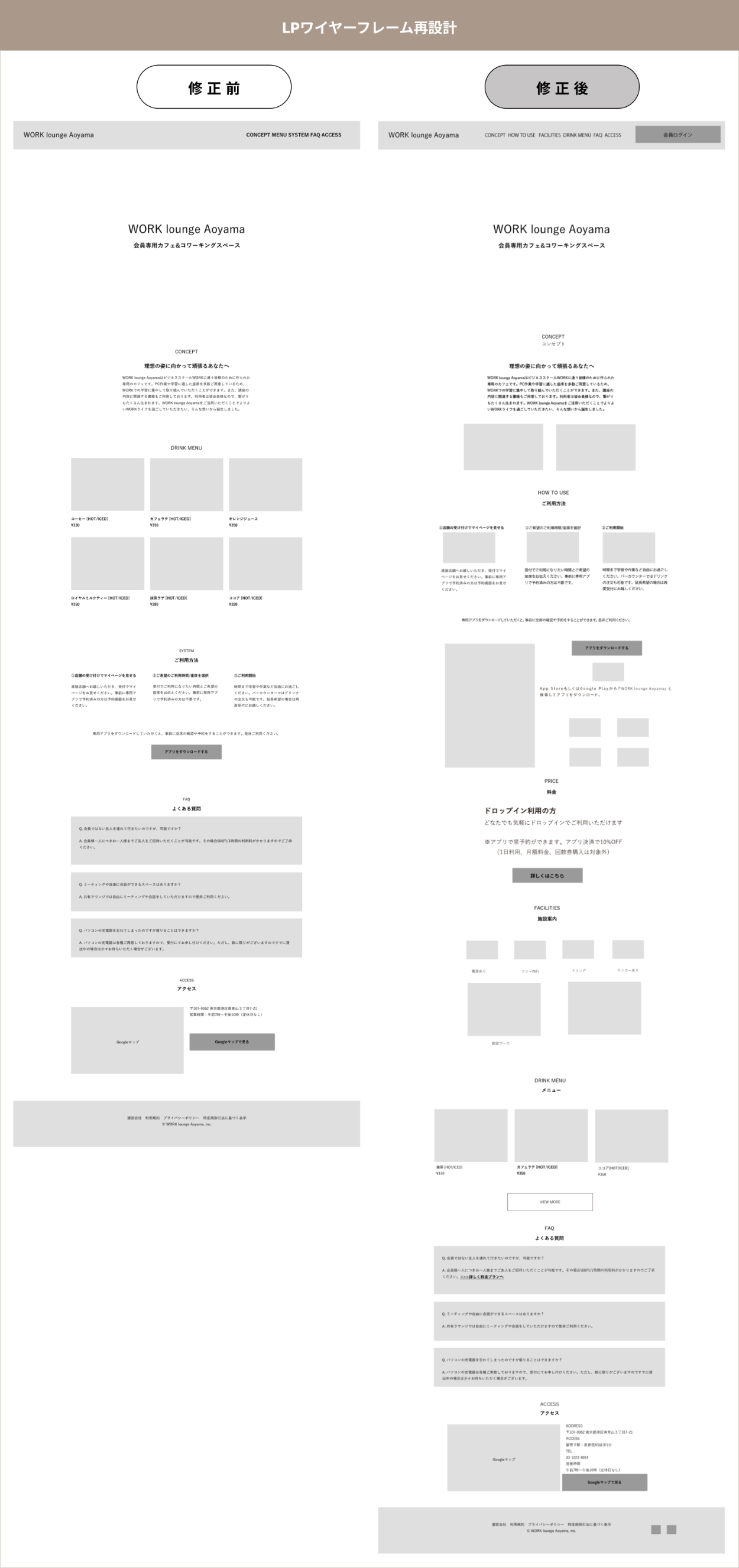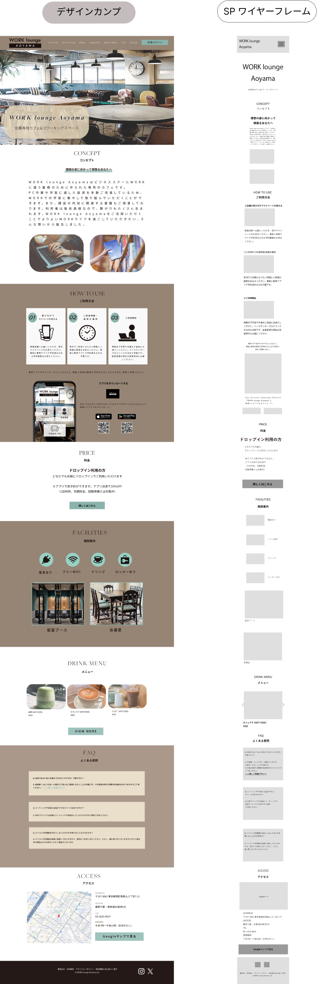 SHElikes MULTI CREATOR COURSEの課題④で、会員専用のカフェ&コワーキングスペースのLP制作に取組みました。クライアントからの要件書を元に、PCのワイヤーフレーム変更とデザインカンプ制作、SPのワイヤーフレームを制作しました。