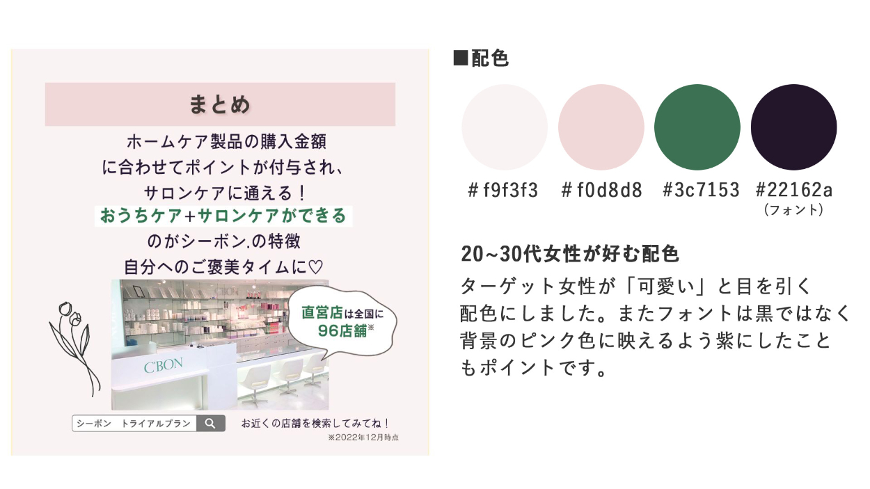 またシーボン様のInstagram投稿を研究し、商品とお花のデザインの投稿が多いと感じたため、統一感が出るよう、あしらいのイラストはお花のイラストを使い、大人かわいい印象にしました。