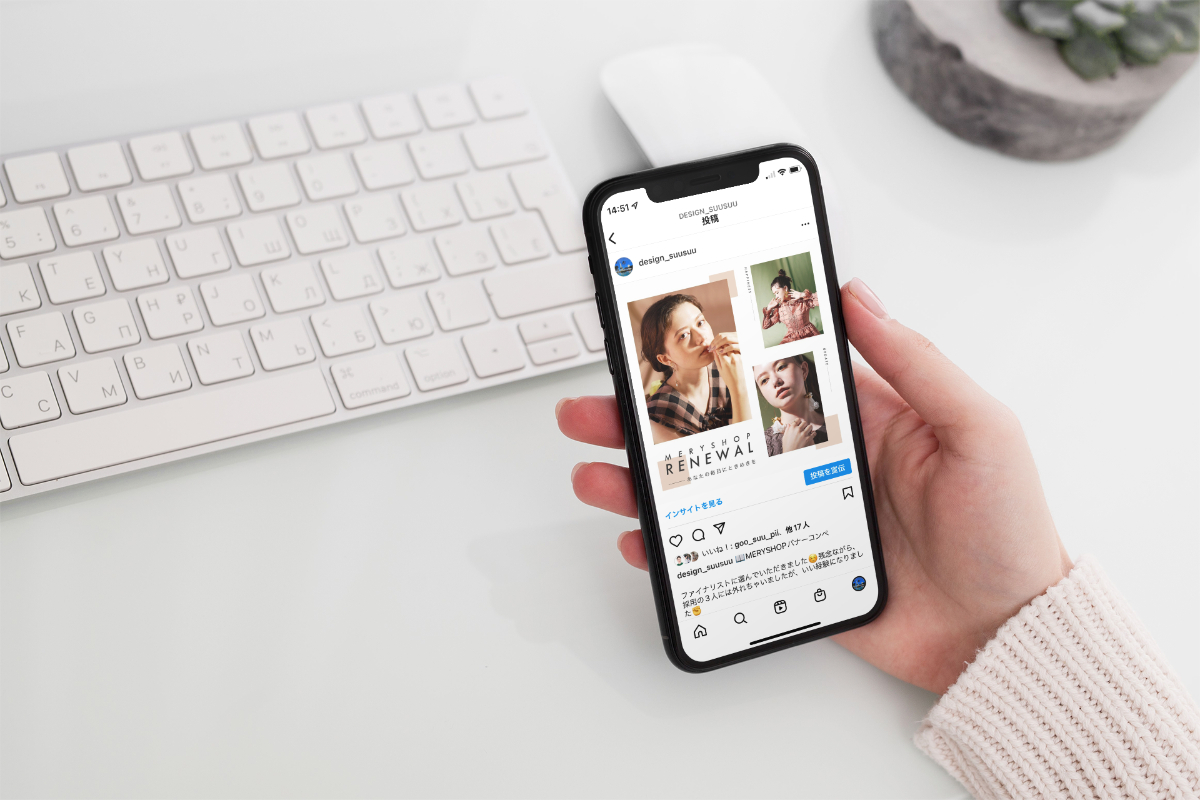 ”大人可愛い”を意識して、英字を多めに使っておしゃれにしたり、抜け感のあるフォントを使用したりして工夫しました。また、写真の背景からスポイトして淡いピンクを使用し統一感を出しました。
