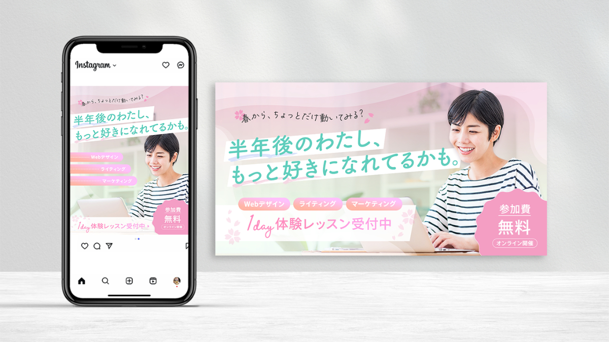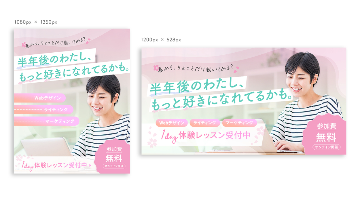 架空の女性向けWebスクールのオンライン無料体験レッスン広告バナーを制作しました。