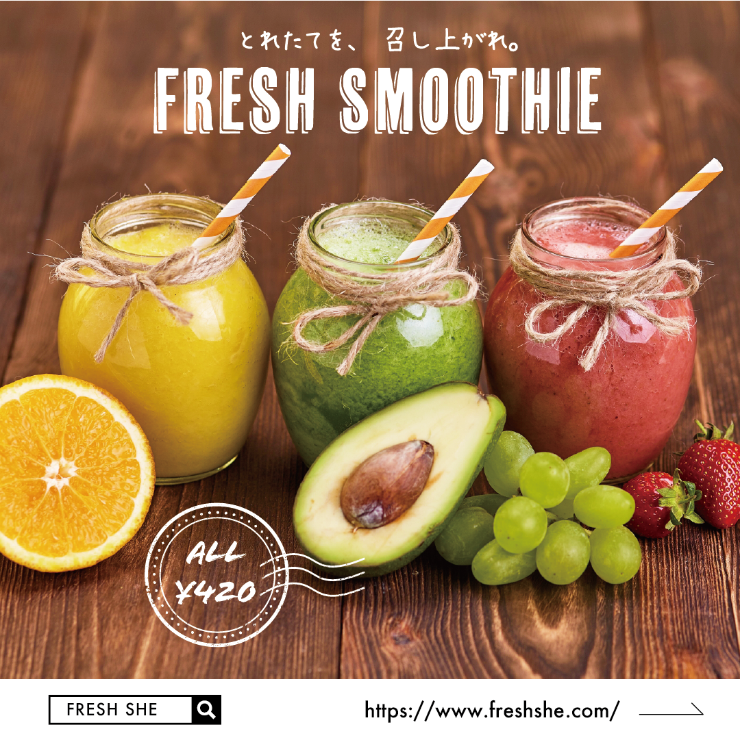 ◆目的:店舗HPへのアクセス数増加 ◆ターゲット: 20代〜30代の健康志向の高い女性。 ◆サイズ:1080×1080 px ◆要望:野菜や果物のフレッシュ感、シズル感を出してほしい。明るい配色を希望。スムージーを身近に感じてもらいたい。